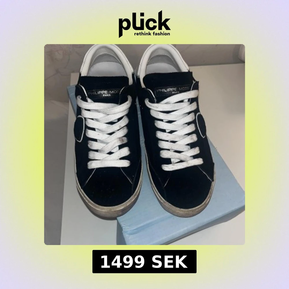 Svarta Philippe Model sneakers i mocka med vita skinn-detaljer och vit platt sula. Klassisk låg modell med snörning och rund tå. Snyggt sköldmärke på sidan och metallnitar för extra edge. Perfekt för dig som gillar stilrena och trendiga sneakers.