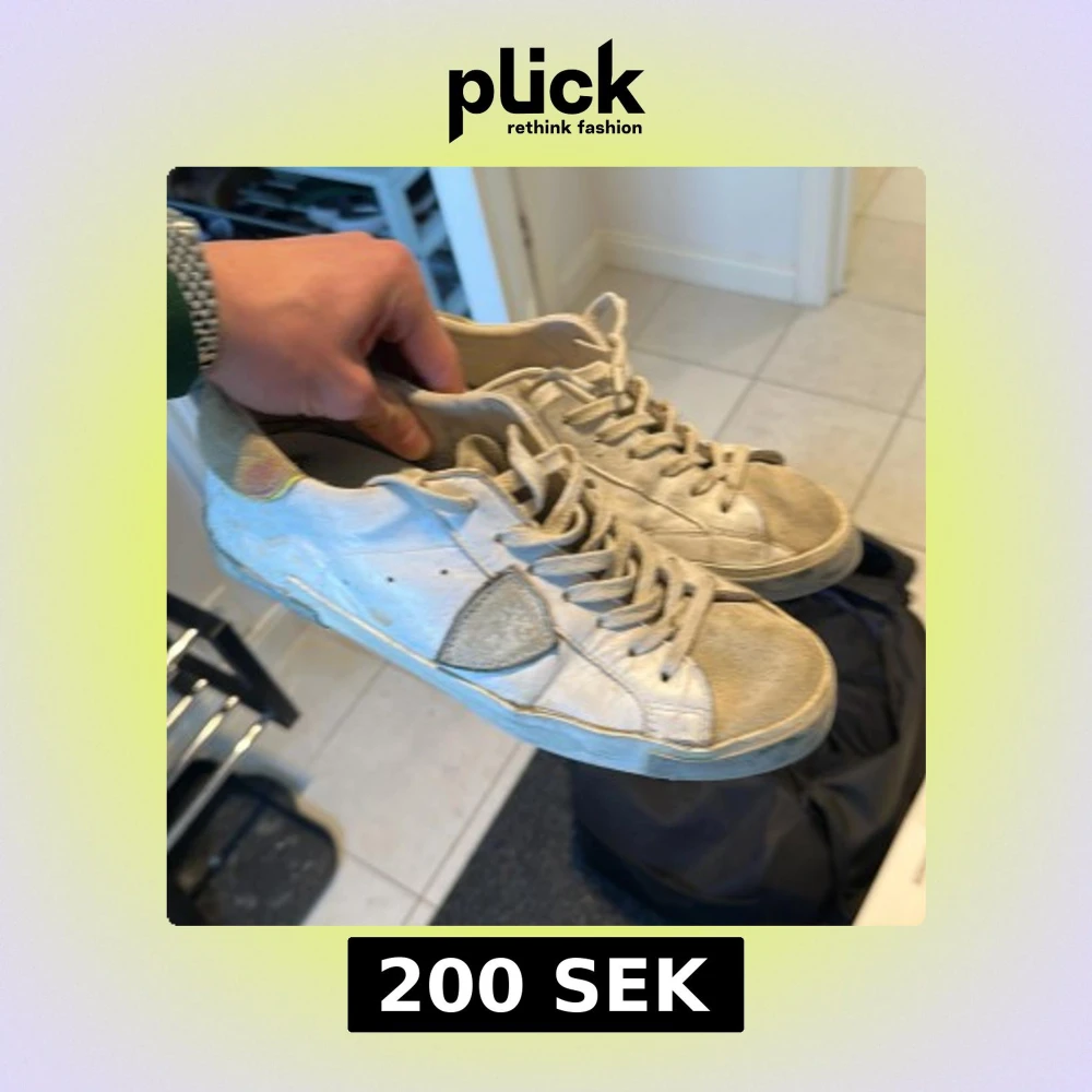 Säljer ett par vita sneakers från Philippe Model med grå detaljer och snörning. Skorna har en klassisk design med en rund tå och en bekväm passform.