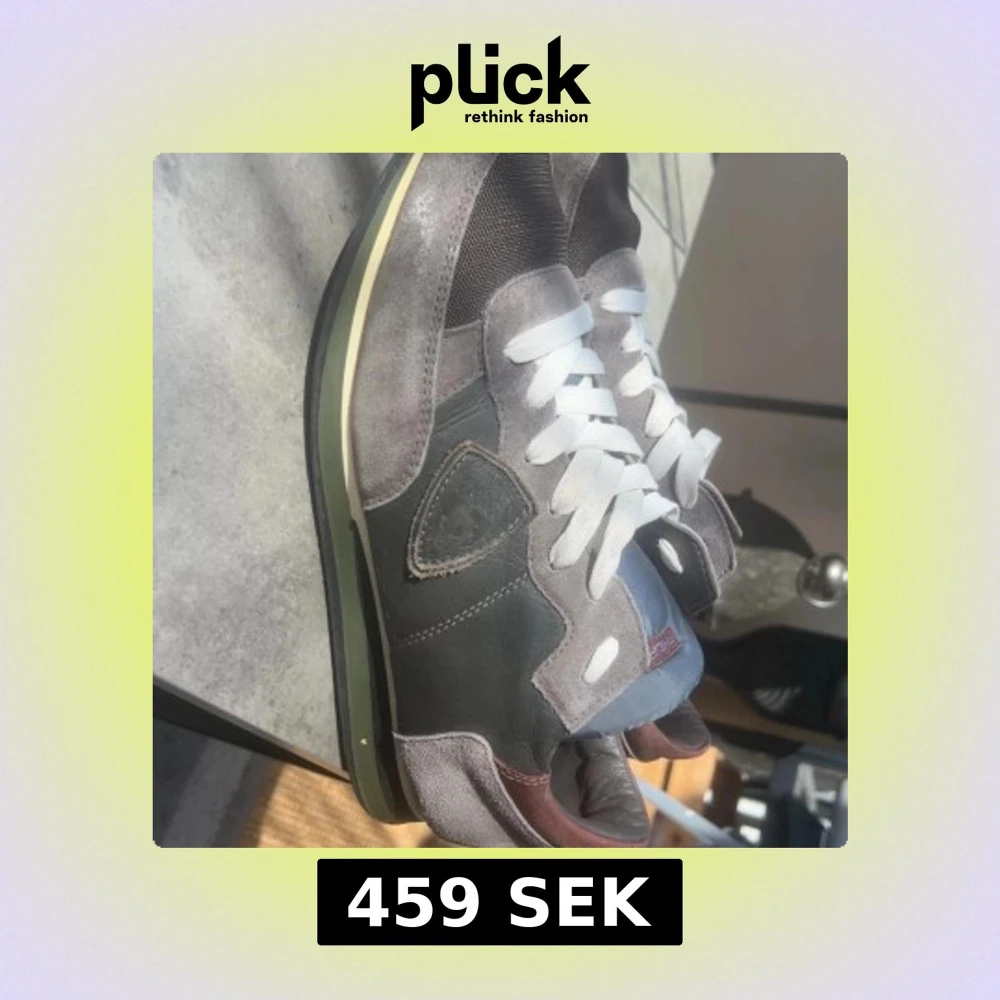 Snygga sneakers från Philippe Model i grå och mörkgrå toner med detaljer i vinrött. Skorna har en mix av mocka och skinn, vit snörning och en rund tå. Sidopanelen pryds av en broderad sköld. Perfekt för dig som gillar stilrena och coola sneakers.