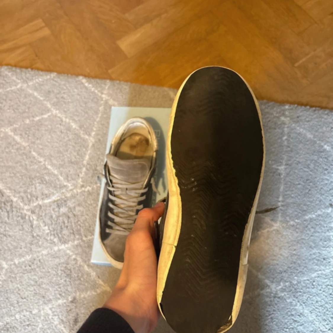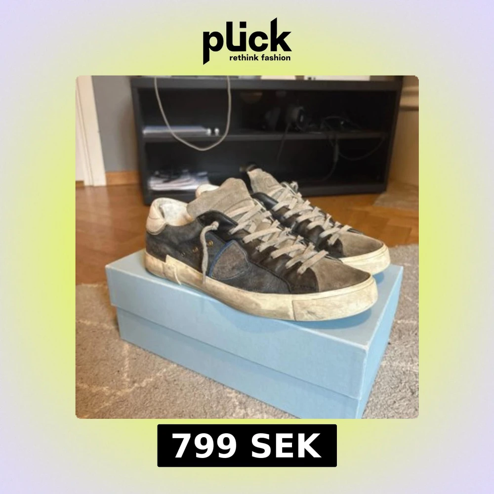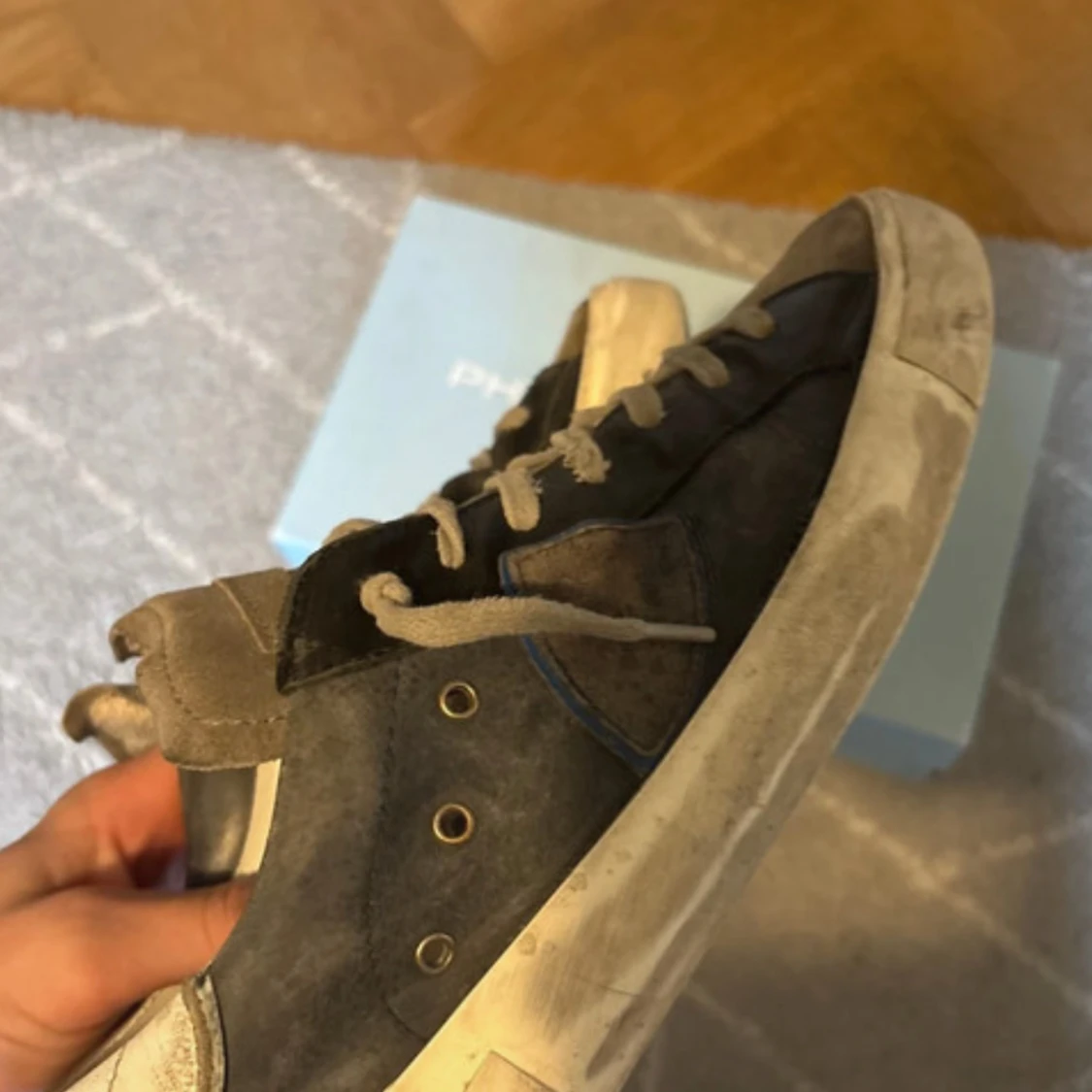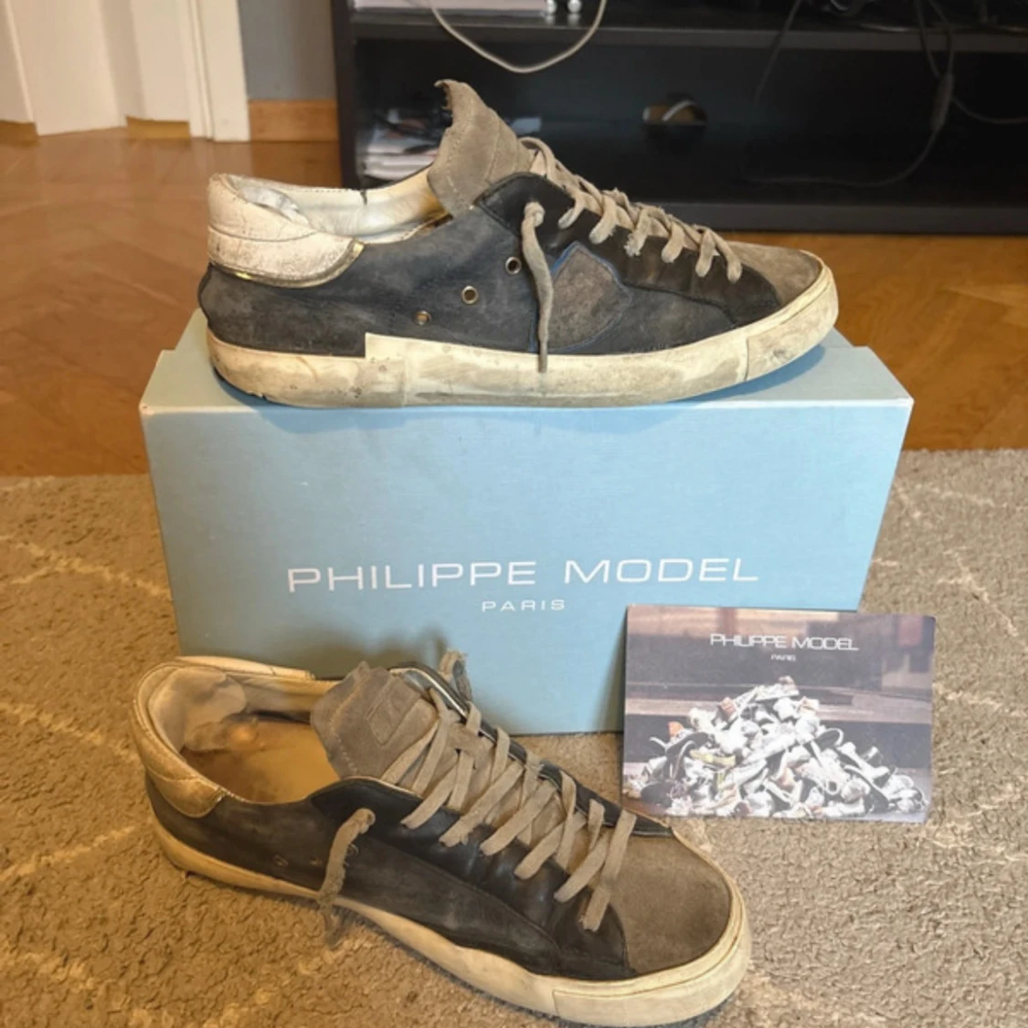Säljer ett par Philippe Model sneakers i svart och grå mocka med detaljer i skinn. Skorna har snörning, rund tå och platt sula. Klassisk design med diskret blå detalj på sidan och vita partier vid häl och sula.
