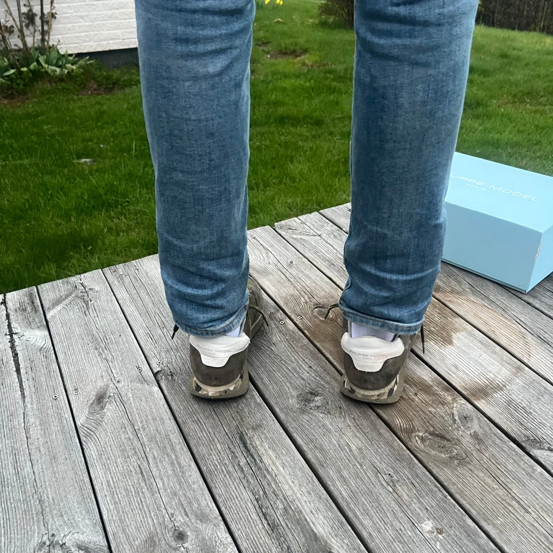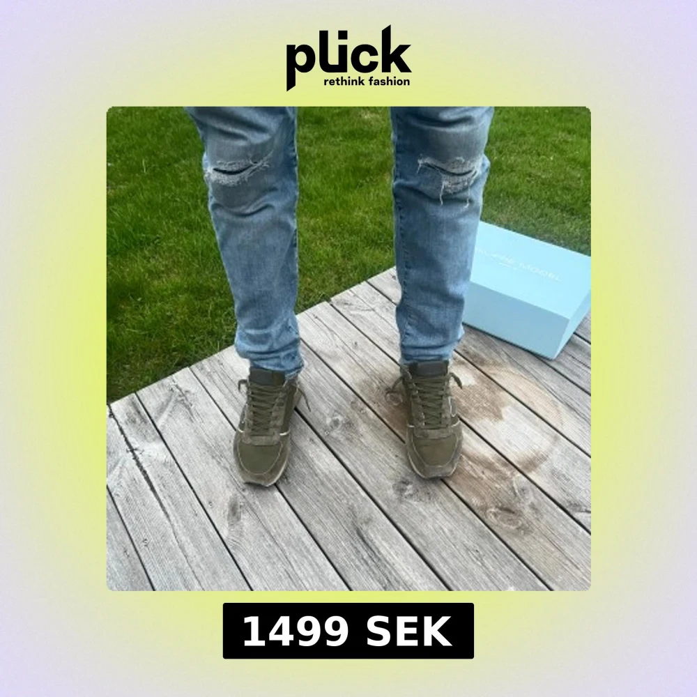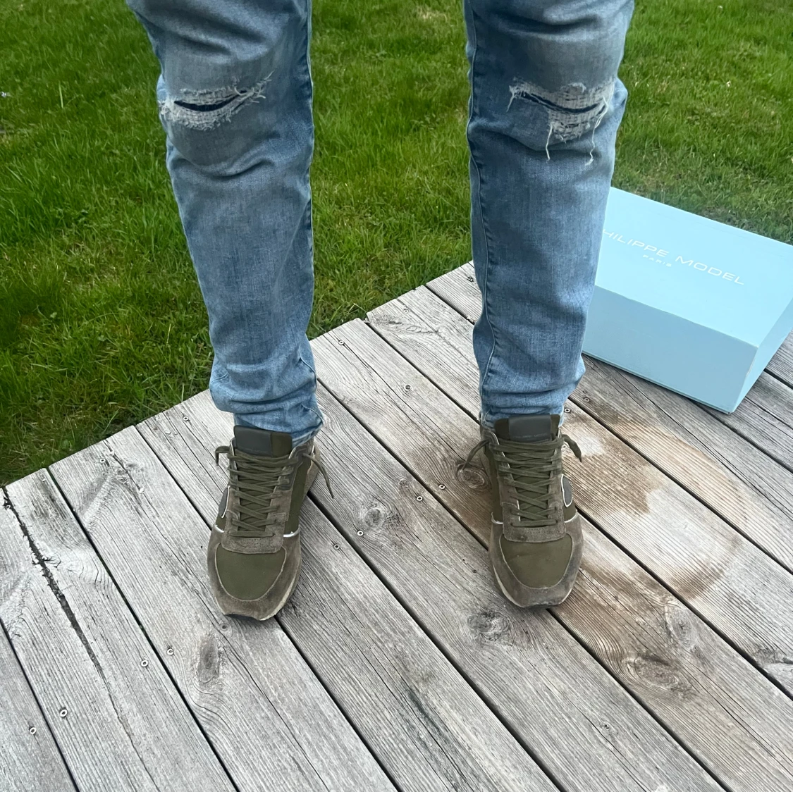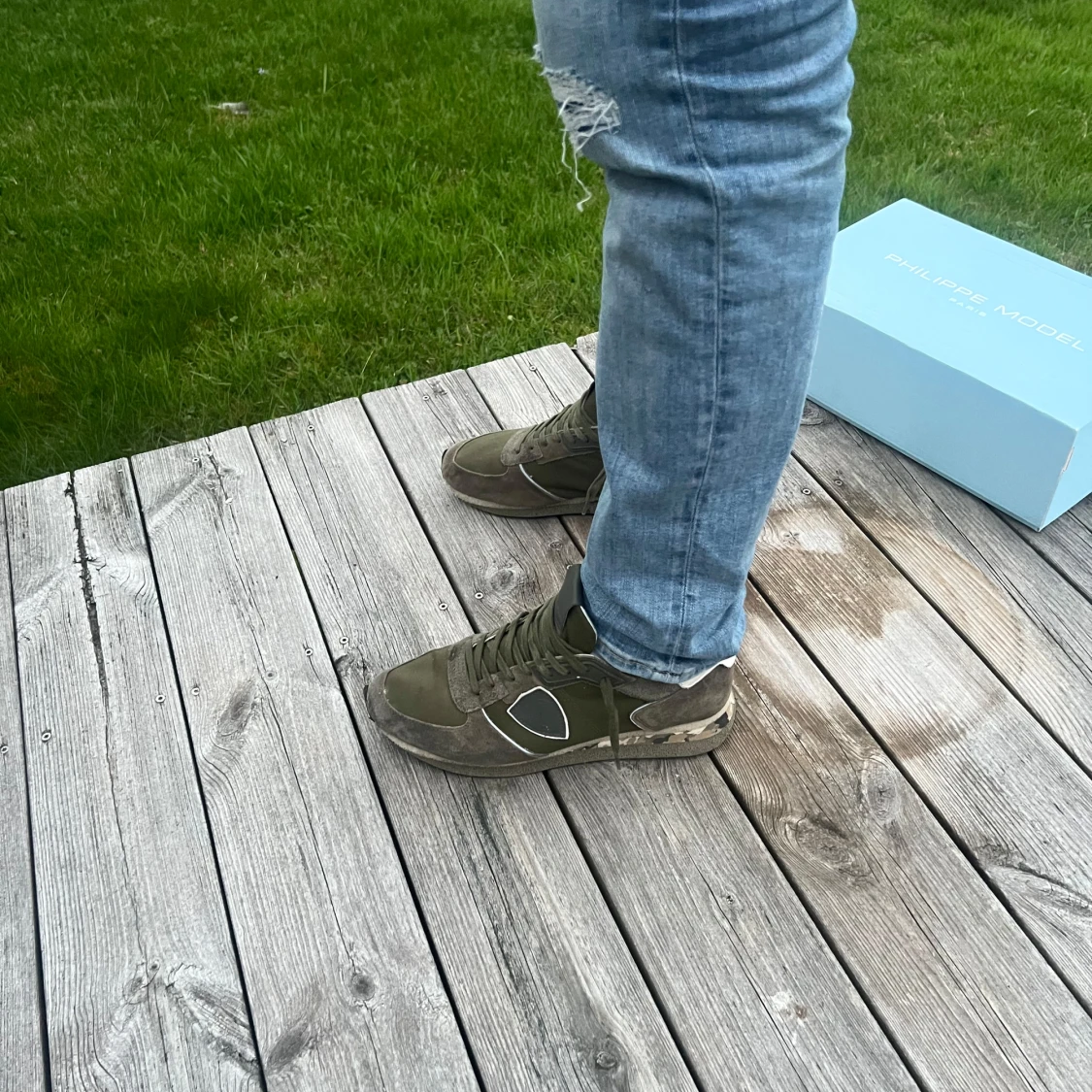 Säljer ett par olivgröna sneakers från Philippe Model med vita och grå detaljer. Skorna har snörning och en platt sula. Perfekta för dig som vill ha en stilren och trendig look. Priset är inte hugget i sten skriv vid intresse!