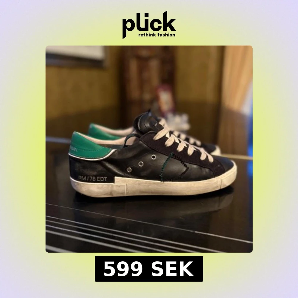 Säljer ett par svarta Philippe Model sneakers med vita sulor, grå snörning och gröna detaljer vid hälen. Skorna har rund tå och är tillverkade i skinn med metallnitar på sidan. Perfekta för dig som gillar stilrena men unika sneakers.