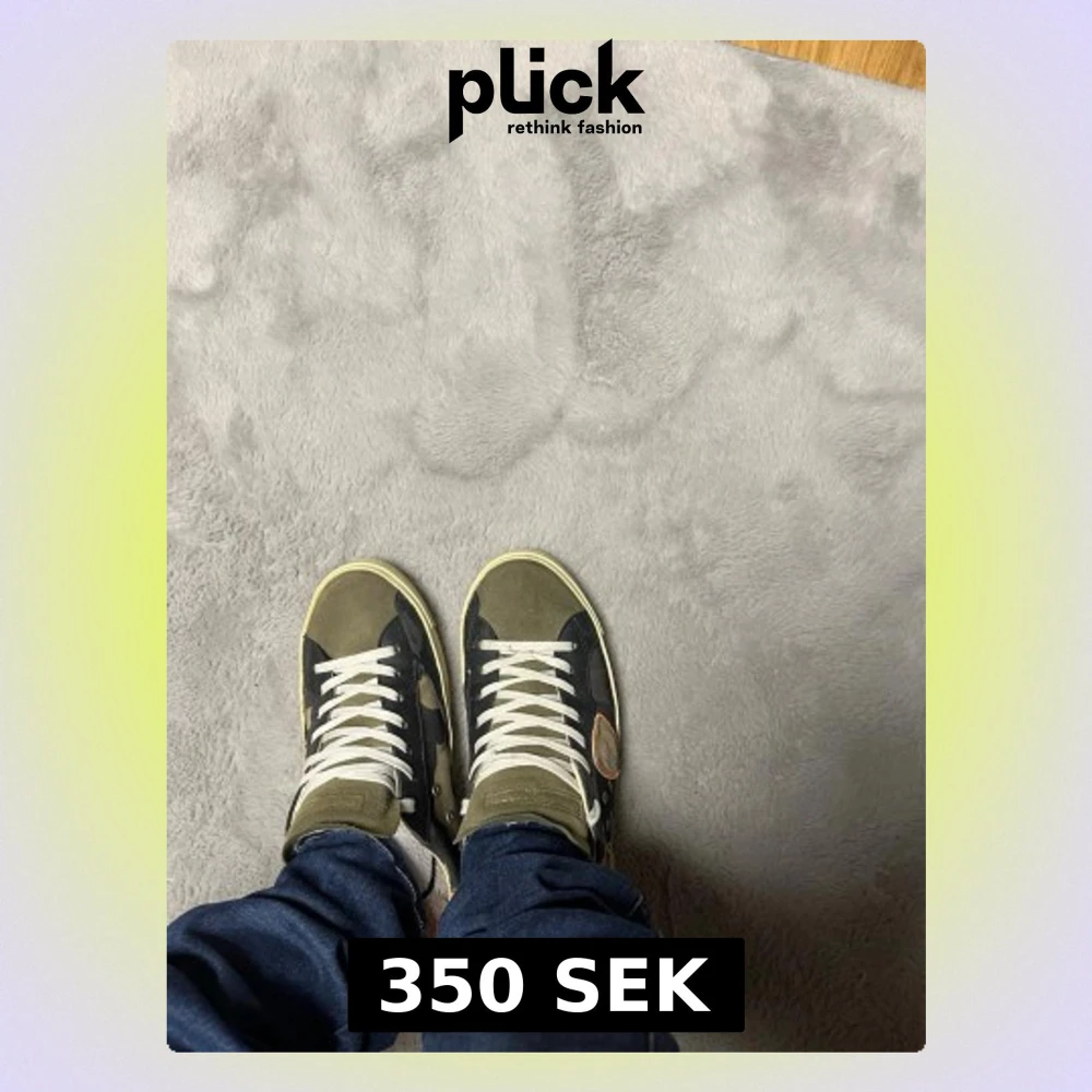 Säljer ett par snygga sneakers från Philippe Model med camouflage-mönster i grönt och svart, vit sula och vita snören. Skorna har en rund tå, platt sula och en cool orange detalj på hälen samt ett emblem på sidan. Perfekt för dig som gillar streetstyle.