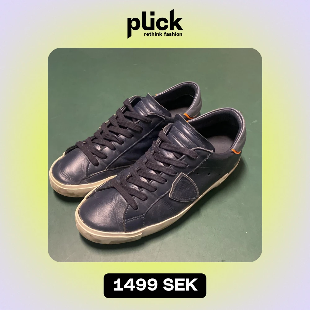 Säljer ett par mörkblå Philipe model PM/78EDT i skinn med snygga orange detaljer vid hälen. Skorna har en klassisk snörning och en vit sula som ger en cool kontrast. Perfekta för både vardag och fest! De är i bra skick med slitage som design på sulan.