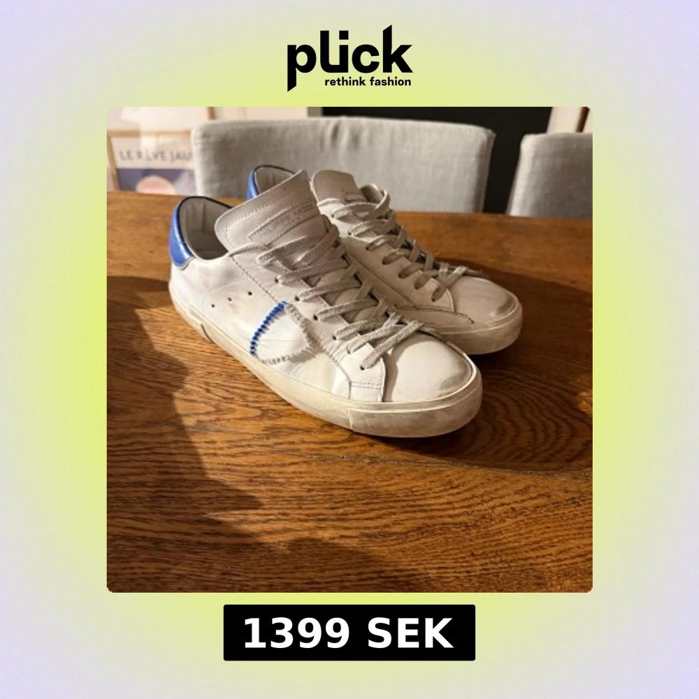 Säljer ett par vita Philippe Model sneakers i skinn med blå detalj på hälen. Skorna har snygg slitning!