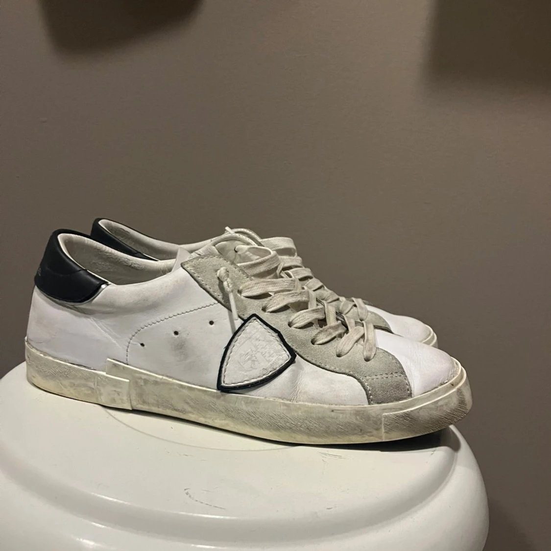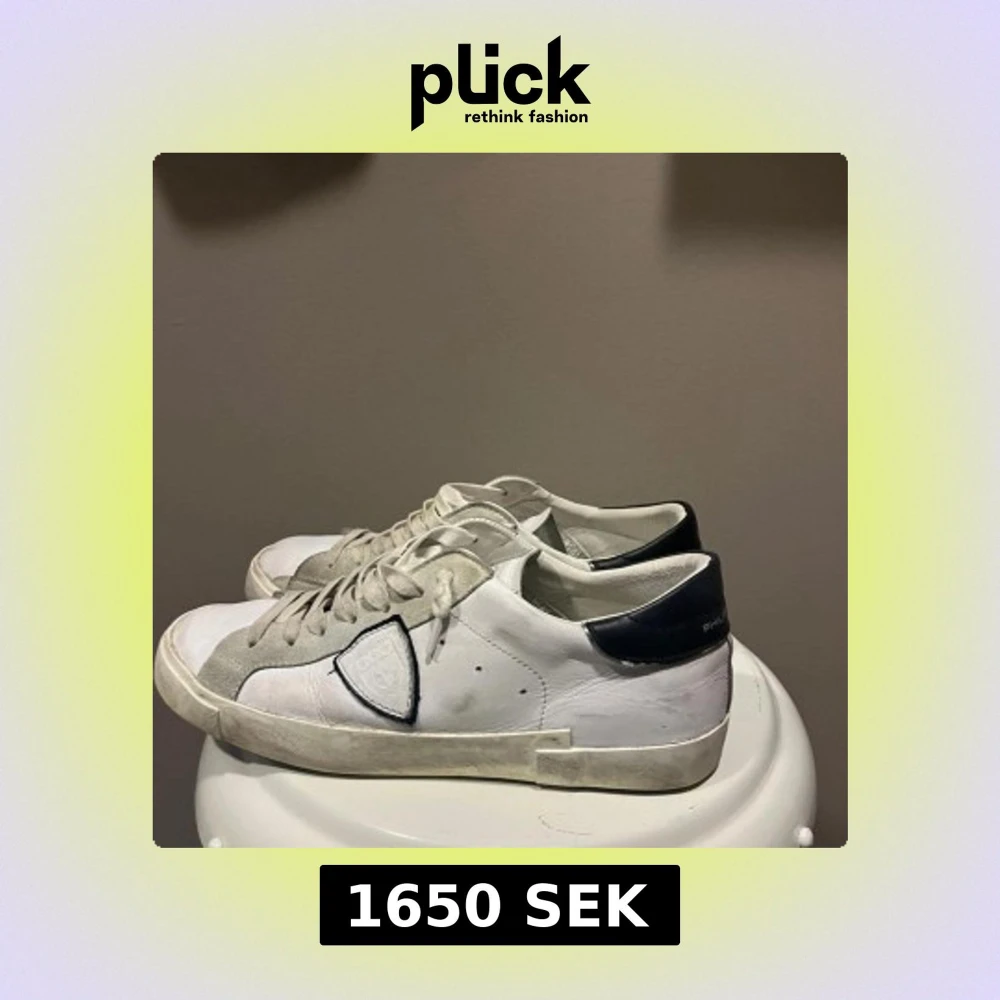 Snygga vita sneakers från Philippe Model med svarta detaljer på hälen och grå mockadetaljer längs snörningen. Skorna har klassisk låg profil, rund tå och platt sula. Tillverkade i skinn och mocka med tydlig logga på sidan och bak på hälen.