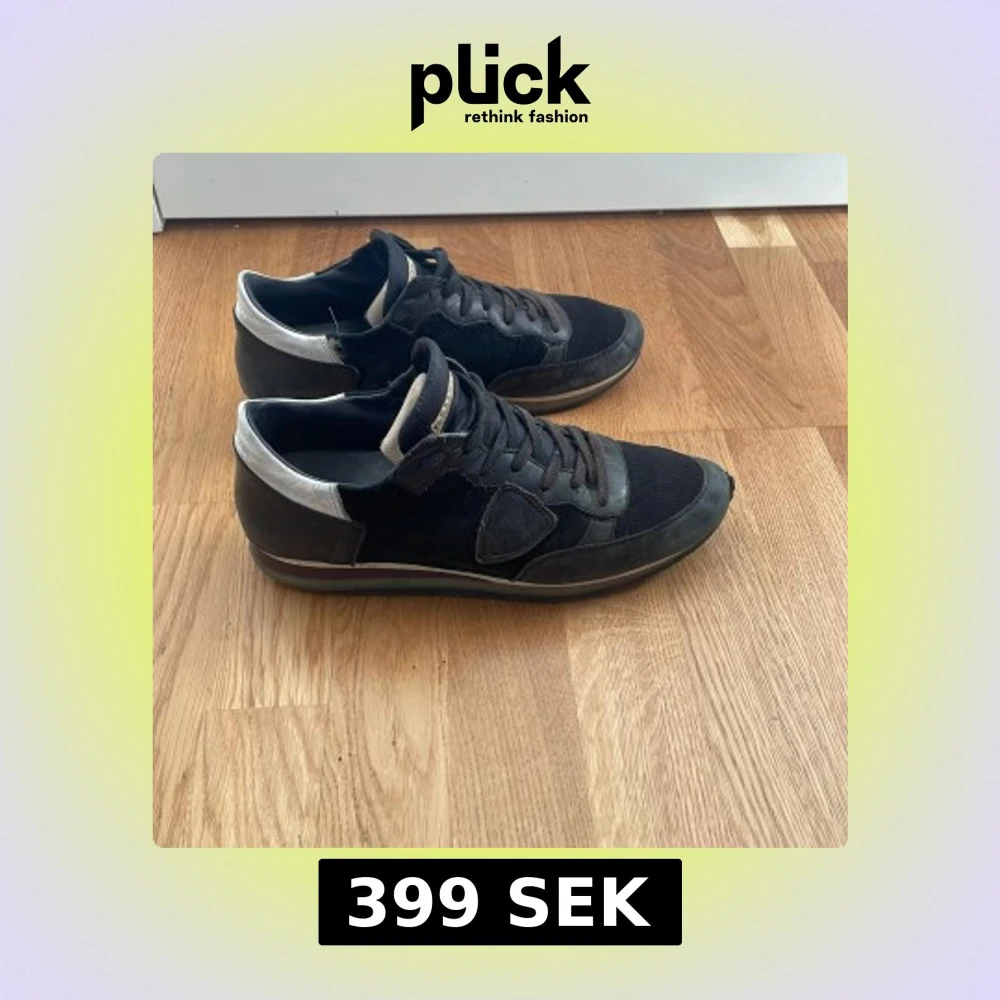 Snygga svarta sneakers från Philippe Model med detaljer i mocka och skinn samt silvriga partier vid hälen. Skorna har snörning och en platt sula. Perfekta för dig som gillar en stilren look. En skada (se på bild 3) på sidan av vänstra skon, men som enkelt går att fixa.