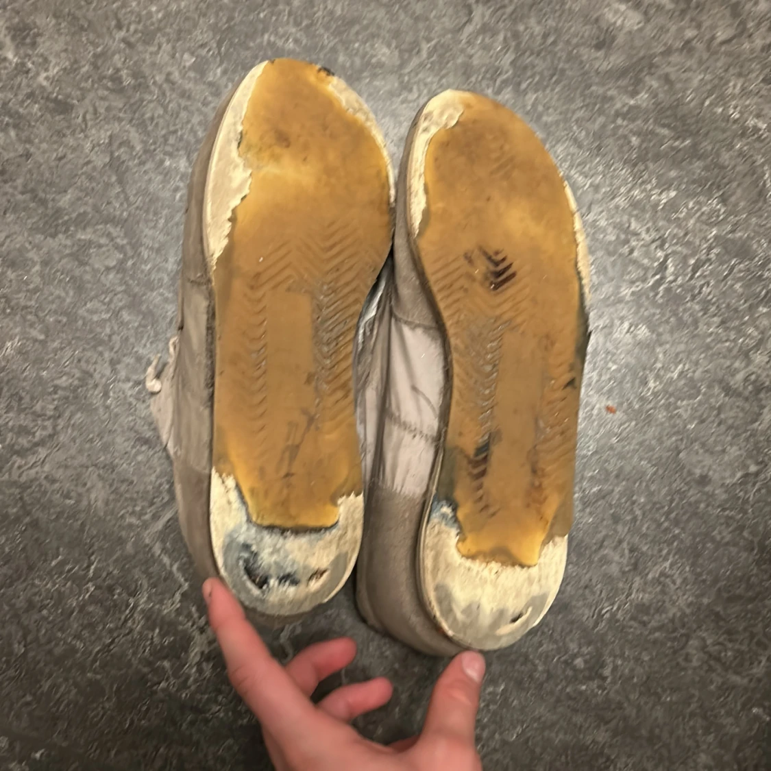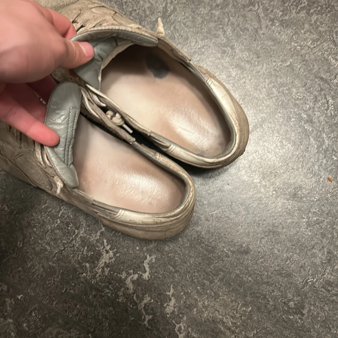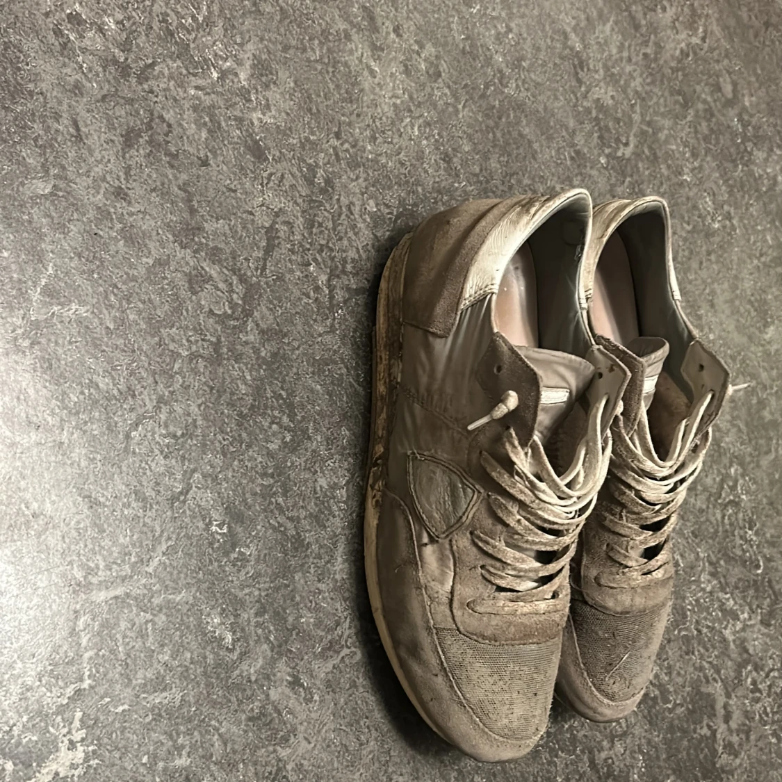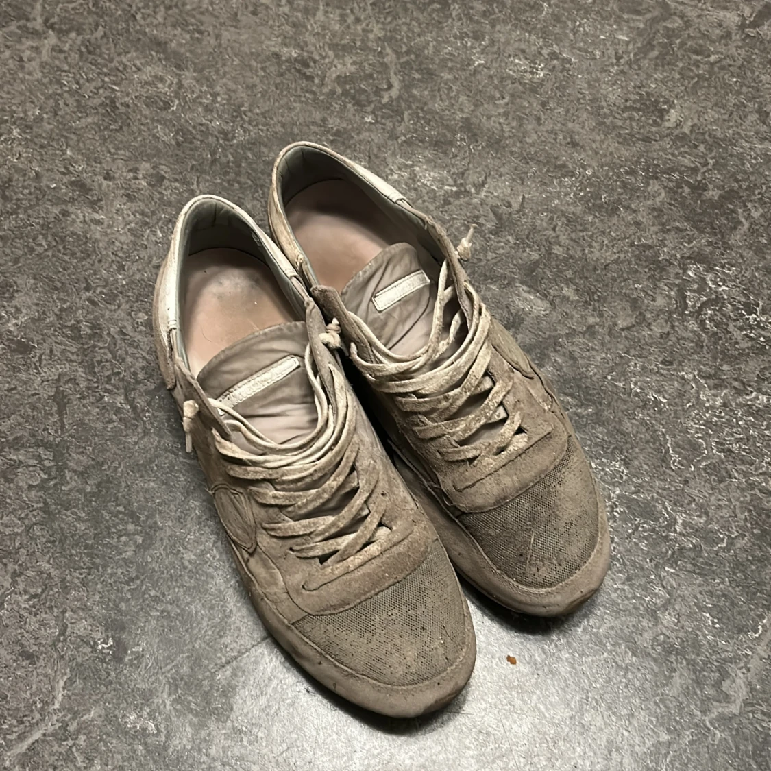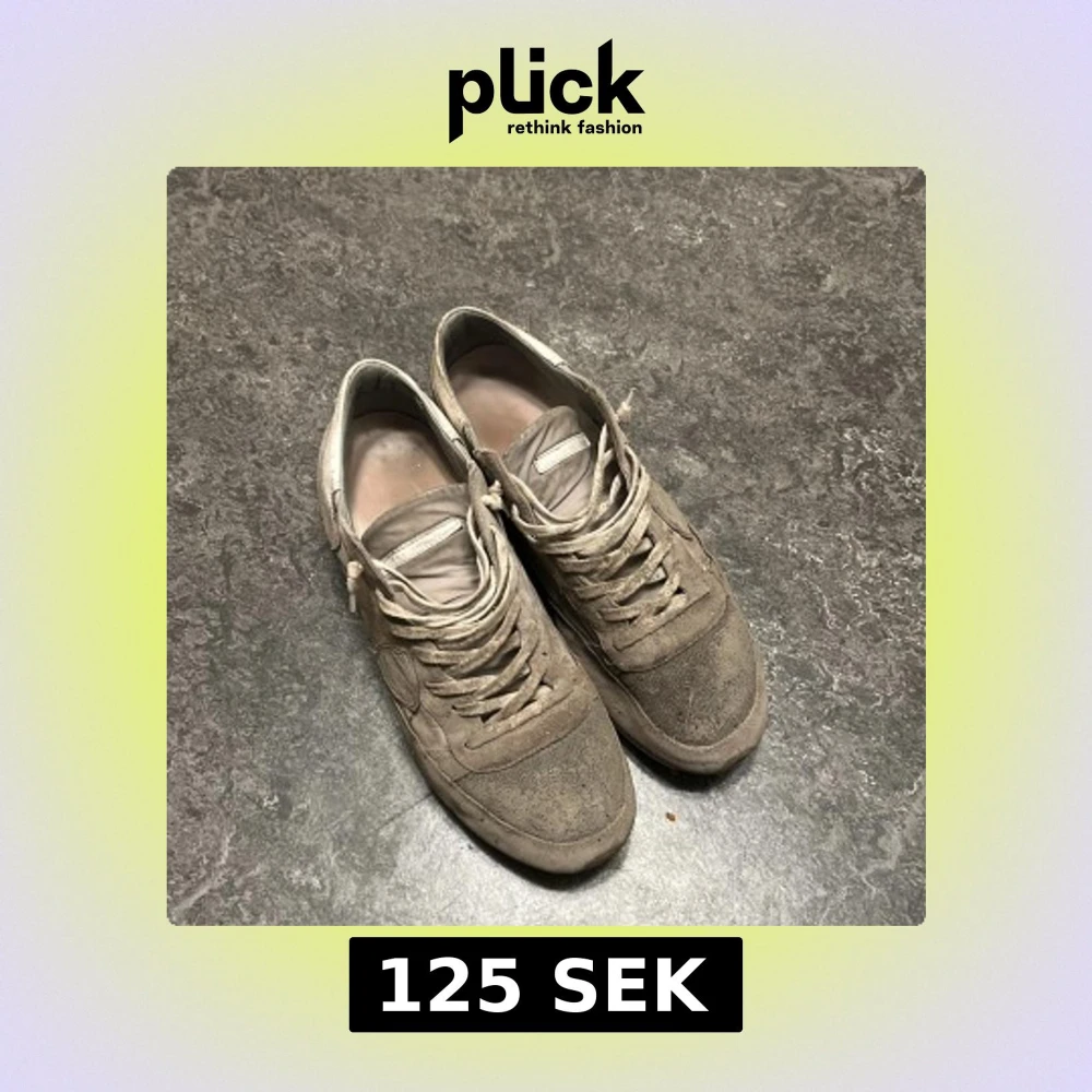 Säljer ett par beige sneakers med ovandel i mocka och detaljer i skinn. Skorna har snörning och platt sula, samt rund tå. Perfekta för dig som gillar en neutral och stilren look till vardags. Klassisk sneakerstil med diskreta sömmar och paneler. Säljer dessa Philippe model som är väldigt slitna och smutsiga, använda mycket och smutsen är från en festival. Vill bara bli av med dom.