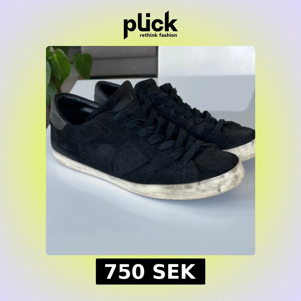 Svarta sneakers från Philippe Model i mocka med svarta skosnören och detaljer i skinn vid hälen. Skorna har en vit, något smutsad platt sula och klassisk låg profil. Perfekta för en avslappnad och trendig streetstil.