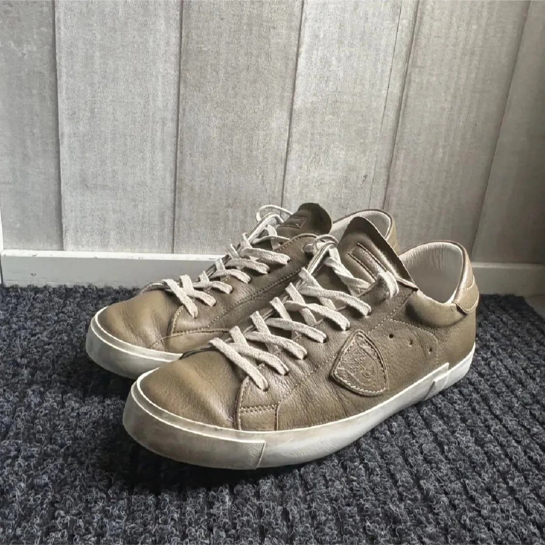 Snygga beige sneakers från Philippe Model med klassisk låg profil och rund tå. Skorna är tillverkade i mjukt skinn med vita snören och vit platt sula. På sidan finns en broderad logotyppatch. Perfekt för dig som gillar stilrena och exklusiva sneakers.