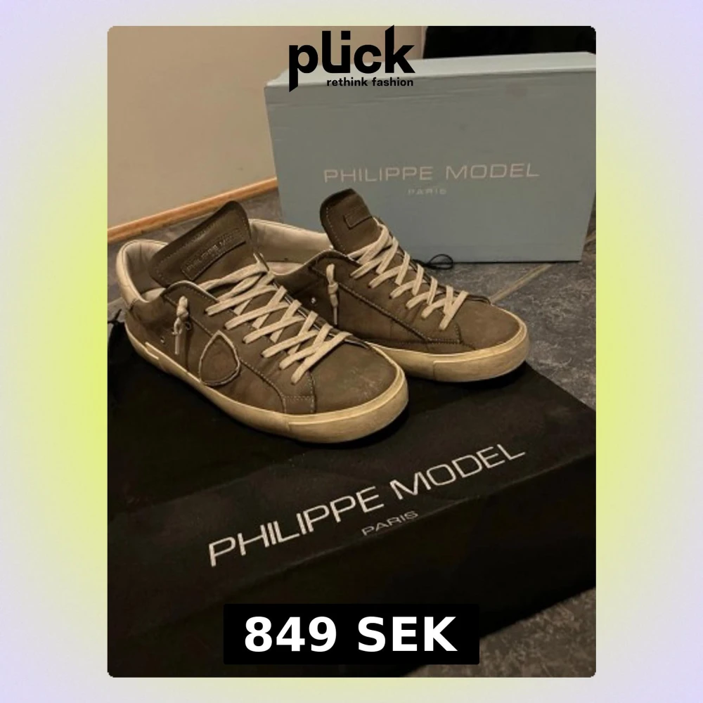 Säljer ett par gråa Philippe Model sneakers med vit sula och vita snören. Skorna är tillverkade i skinn och har en rund tå samt platt sula. Klassisk design med diskret logga på sidan och tungan. Perfekt för dig som gillar stilrena och exklusiva sneakers. Det är även en väldigt skön sko med en kudde för dämpning i hälen.