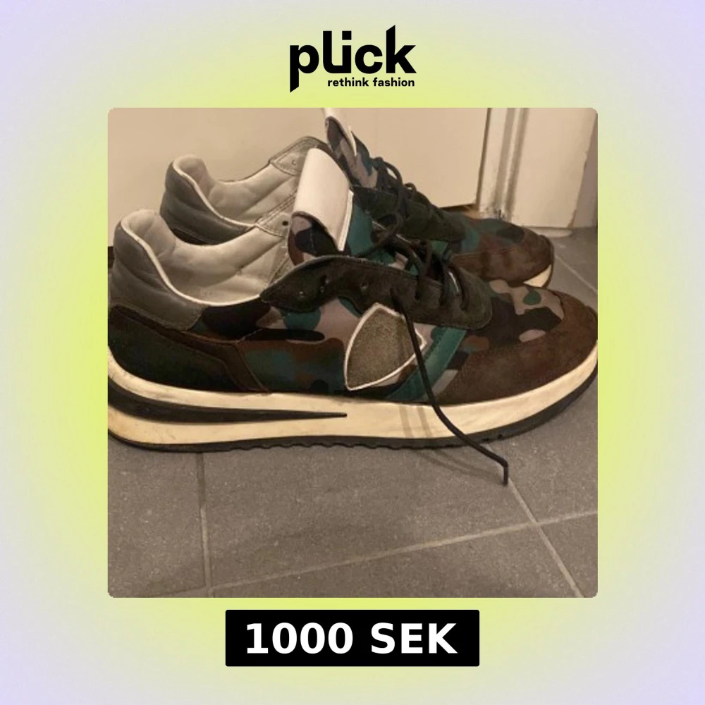 Snygga sneakers från Philippe Model med camouflage-mönster i grönt, svart och grått. Skorna har detaljer i mocka och skinn, vit plös och svart/vit sula. Klassisk snörning och rund tå ger en sportig vibe. Perfekta för dig som gillar streetstyle och unika detaljer.