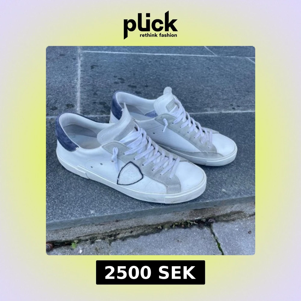Snygga vita sneakers från Philippe Model med grå mockadetaljer och mörkblå häl. Använda varsamt. Köpta i somras. Box och dust bag följer med.