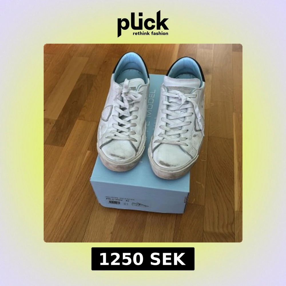 Snygga vita sneakers från Philippe Model med svarta detaljer på hälen och ljusblå insida. Klassisk låg modell med snörning och rund tå. Tillverkade i skinn med diskret logga på sidan. Perfekta för en clean och stilren look.