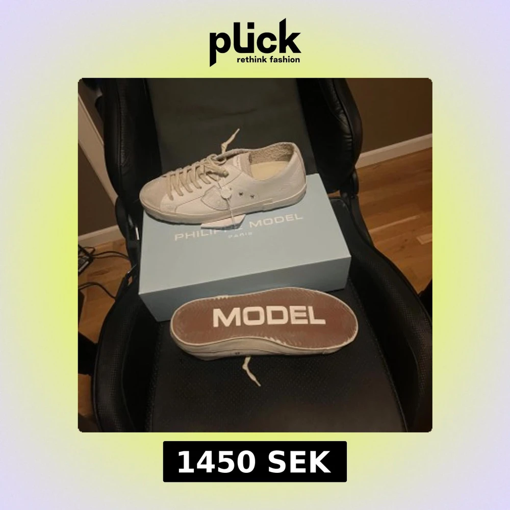 Säljer ett par stilrena vita sneakers från Philippe Model Paris. Skorna har klassisk låg profil, snörning och detaljer i både skinn och mocka. Sulan har tydlig branding med 'PHILIPPE' och 'MODEL' undertill. Perfekta för dig som gillar minimalistisk och exklusiv streetstil.