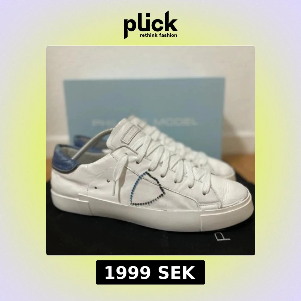Snygga vita sneakers från Philippe Model med blå häl och coolt broderat mönster på sidan. Skorna har rund tå, platt sula och klassisk snörning. Tillverkade i skinn för en lyxig känsla och har en stilren, modern look som passar till jeans eller shorts. Box och gympapåse medfölje, men boxen är rätt sliten.