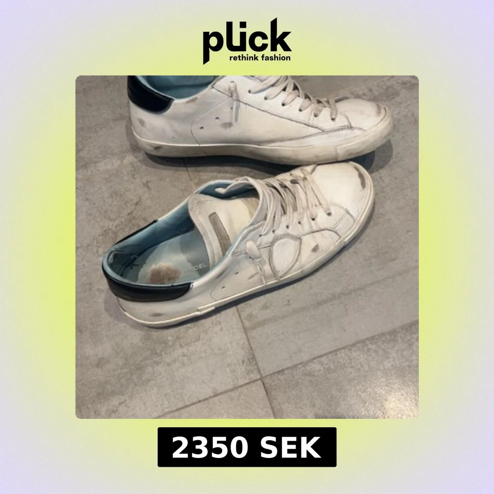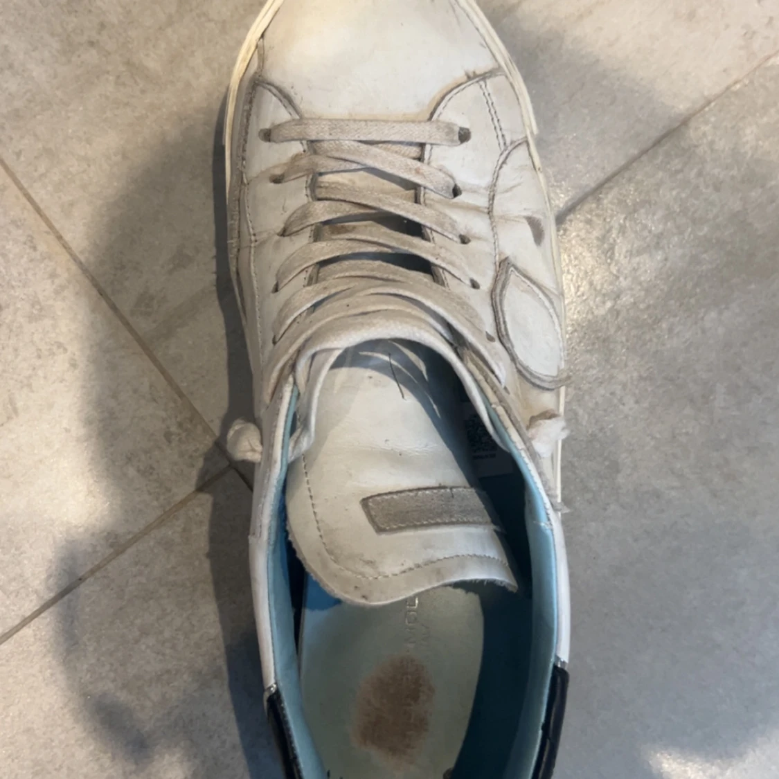 Snygga vita sneakers från Philippe Model med svarta detaljer på hälen och ljusblå insida. Skorna har klassisk snörning och är tillverkade i skinn. Perfekta för dig som gillar en stilren och sportig look.