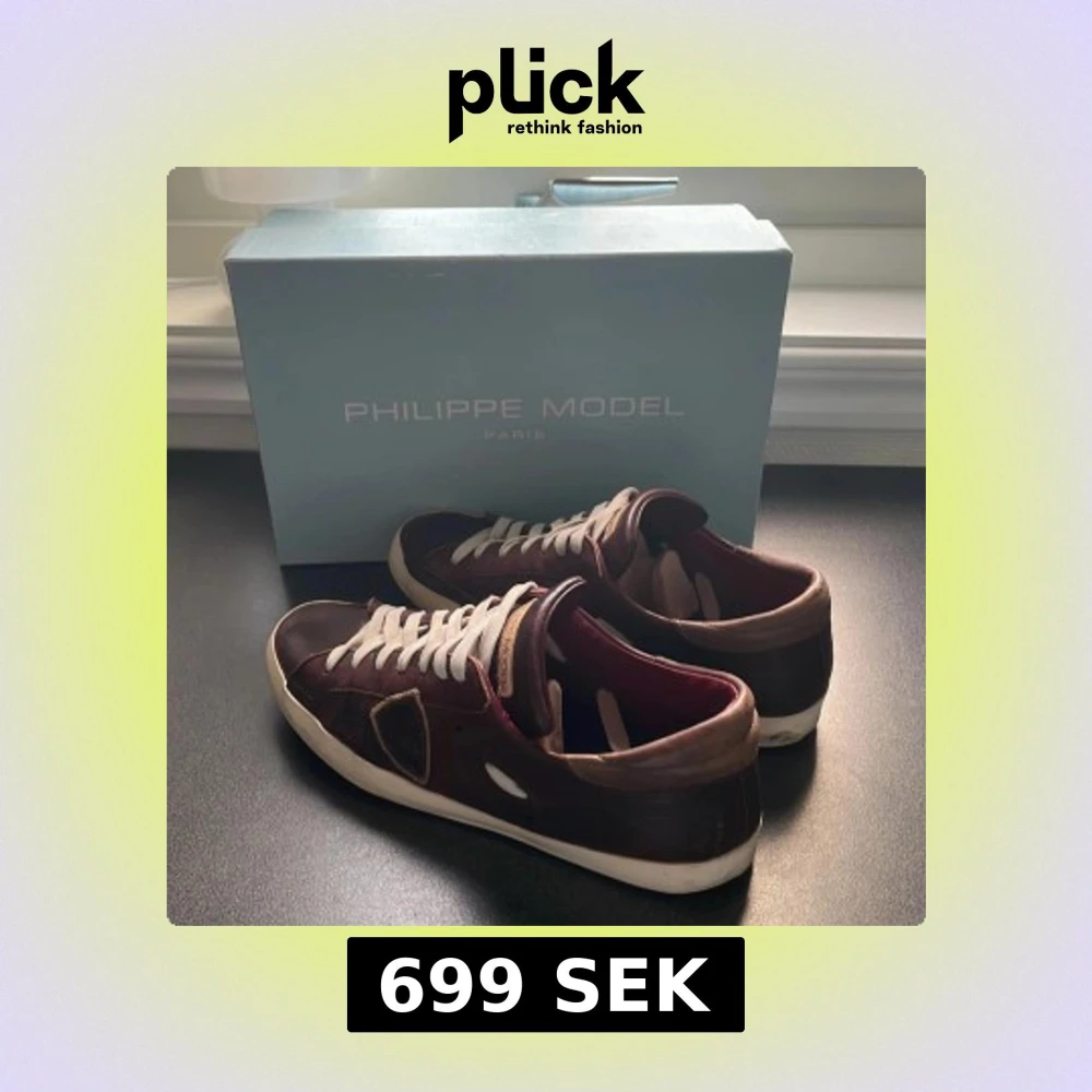 Snygga bruna Philippe Models med vit snörning! Du får med ett par bruna snören också vid köpet.👌Skolåda ingår🔥 Enda defekten på skorna är ett litet hål vid hälen men annars är det inget annat. Ställ gärna fler frågor!👑