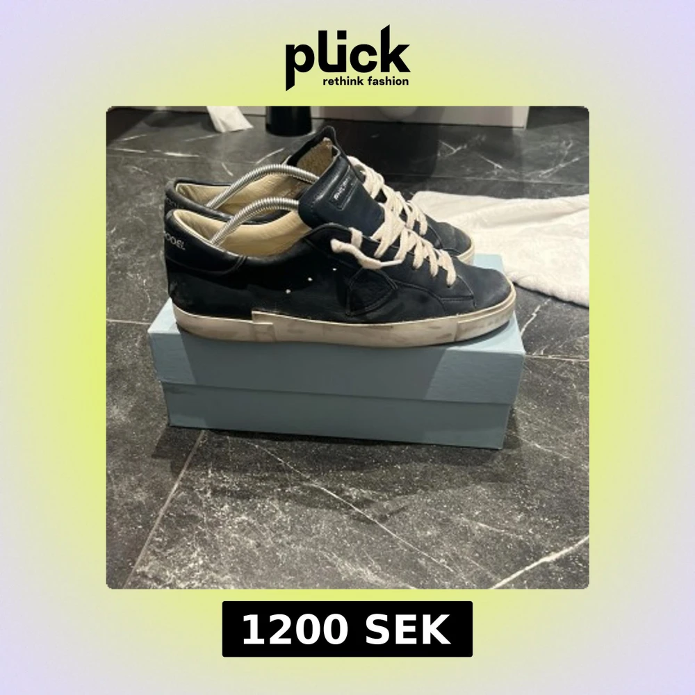 Mörk blå Philippe Model sneakers i skinn med vita snören och vit sula. Klassisk modell med inga defekter. Har använt skorna sparsamt och kommer med box. Skrive gärna om frågor eller mer bilder om skorn.