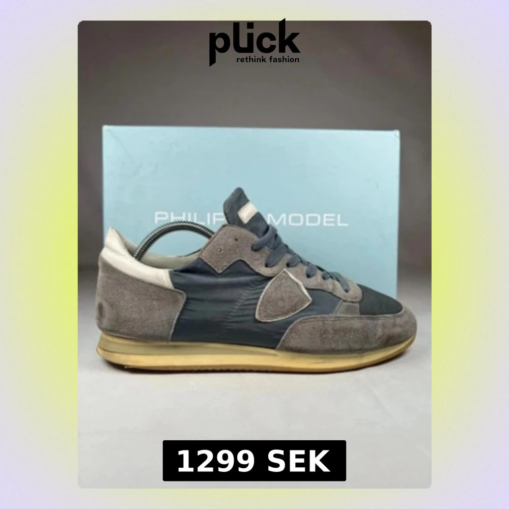 Snygga sneakers från Philippe Model i en mix av grått och blått med beige detaljer. Ovandelen är tillverkad i mocka och textil, med klassisk snörning och platt sula. OBS: Box medföljer ej vid köp!