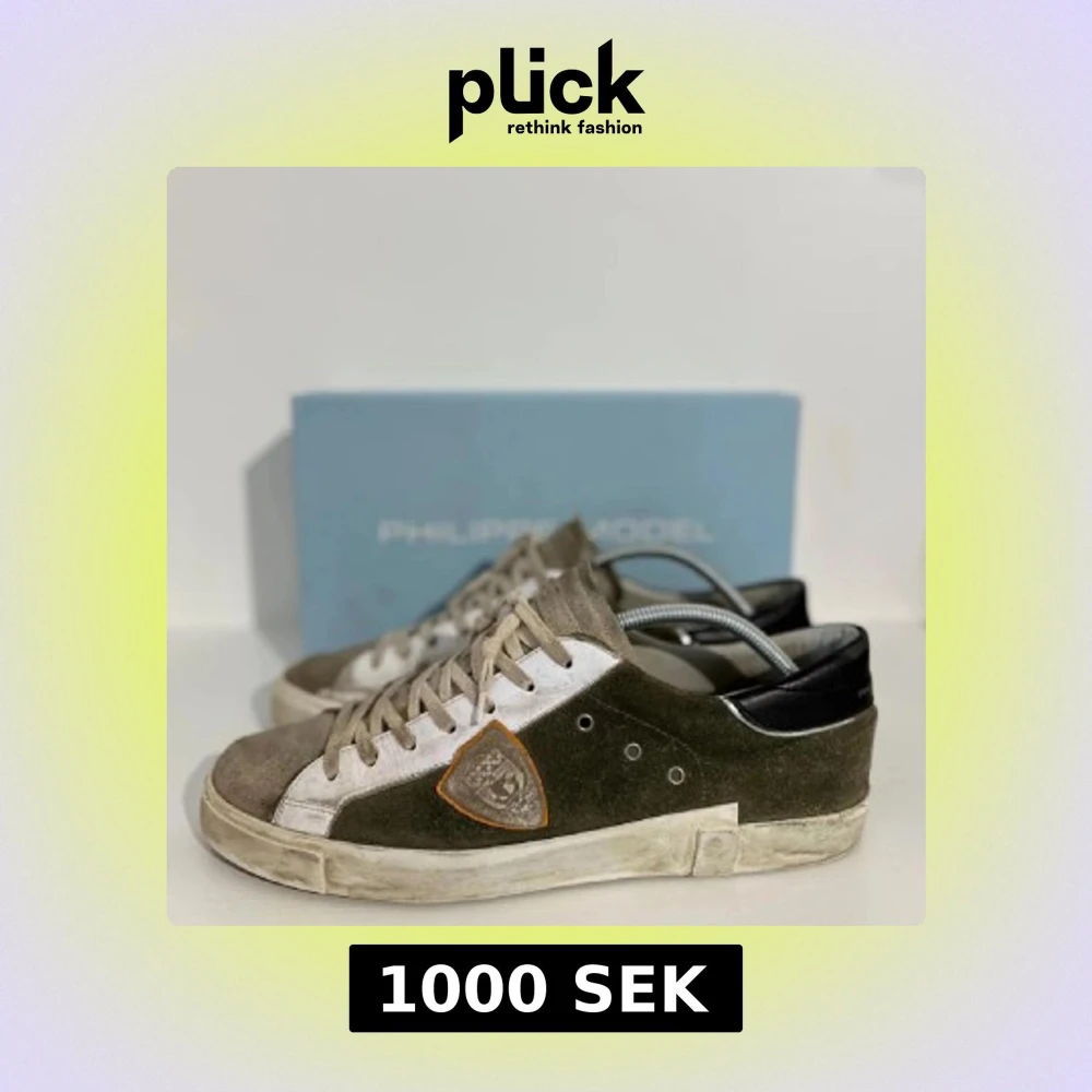 Snygga gröna sneakers från Philippe Model med vita och svarta detaljer. Skorna har en klassisk snörning och en unik logotyp på sidan. Har använts, men ska även se slitna ut i modellen. Lådan ingår inte har tappat den