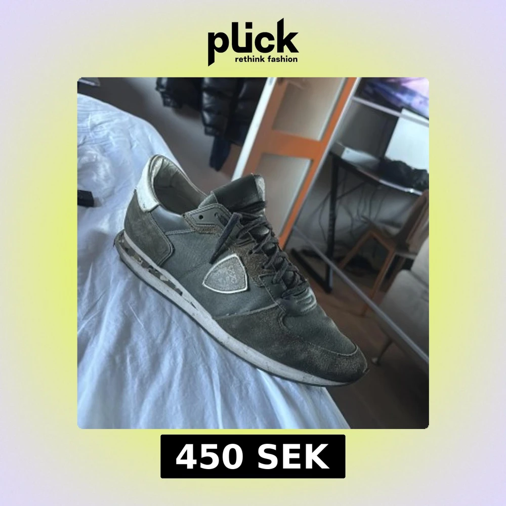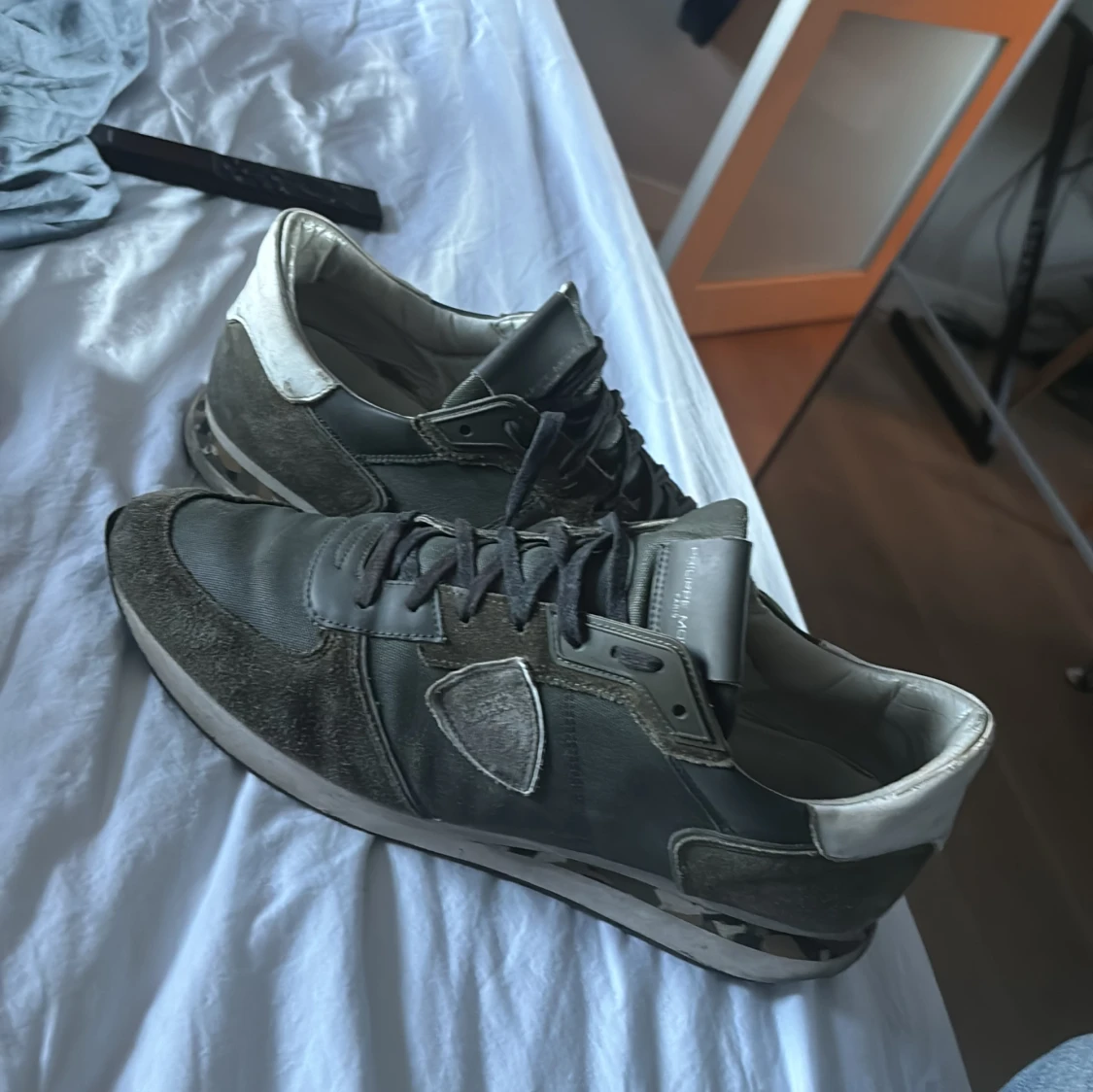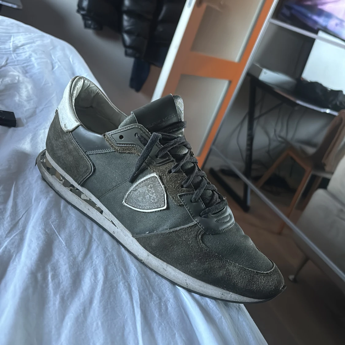 Snygga sneakers från Philippe Model i grå och mörkgrön mocka och textil med vita detaljer. Skorna har snörning, rund tå och en unik mönstrad sula. Perfekta för dig som gillar stilrena men ändå unika sneakers. SKICKET ÄR HELT OKEJ SKULLE SÄGA MER EN OKEJ!