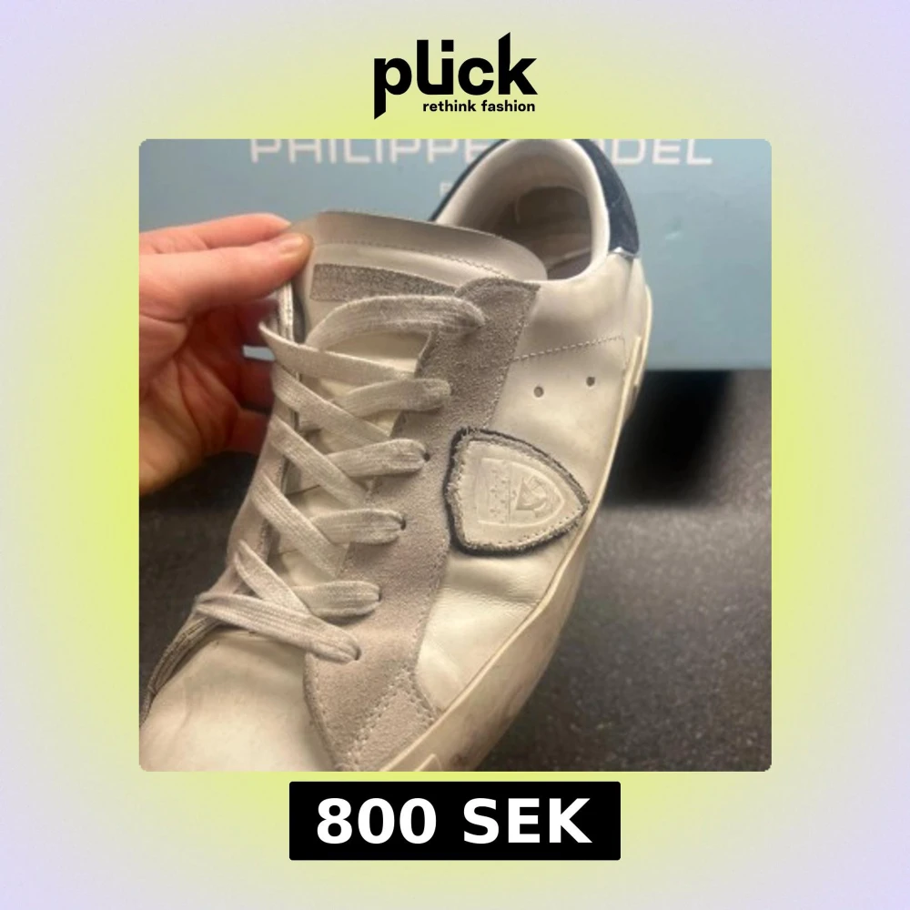 Snygga vita sneakers från Philippe Model med detaljer i grå mocka och mörkblå häl. Skorna har snörning, rund tå och en platt gummisula med tydlig logga undertill. Klassisk design med sköldpatch på sidan och stilrena kontraster.