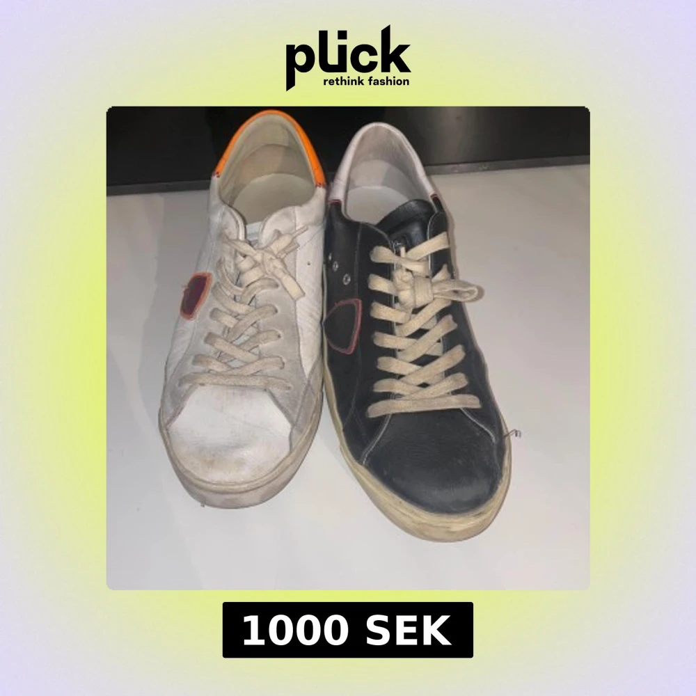 Unika sneakers i svart och vit med kontrasterande färgdetaljer. Det ena paret är svart med vita snören och de andra är vit med orange och röda detaljer. Skorna har en klassisk snörning och en bekväm sula. 1000kr styck/ rabatt om man köper båda, kan gå ner i pris vid snabb affär