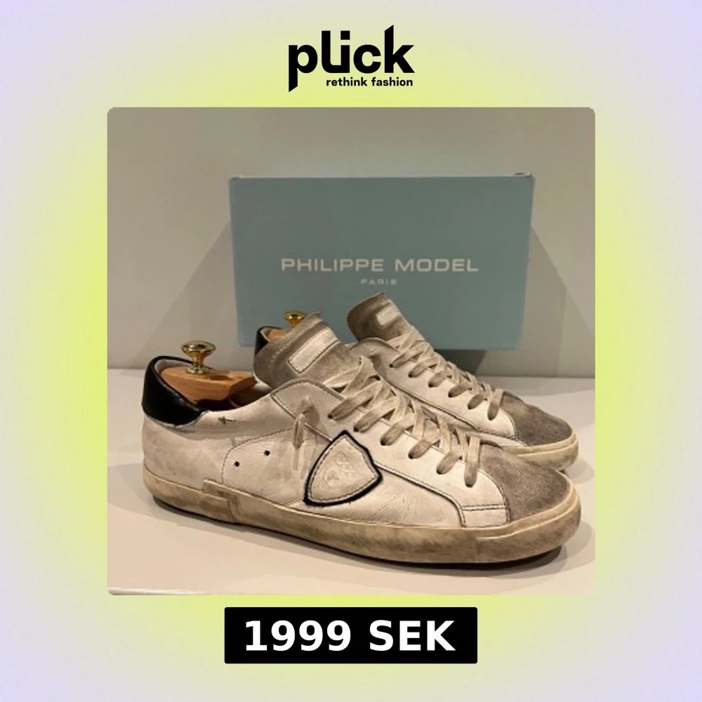 Snygga vita sneakers från Philippe Model med grå mockadetaljer på tå och plös, svart hälkappa och klassisk snörning. Skorna har en rund tå, platt sula och ikonisk sköldlogga på sidan. Perfekta för dig som gillar en stilren men ändå edgy look.