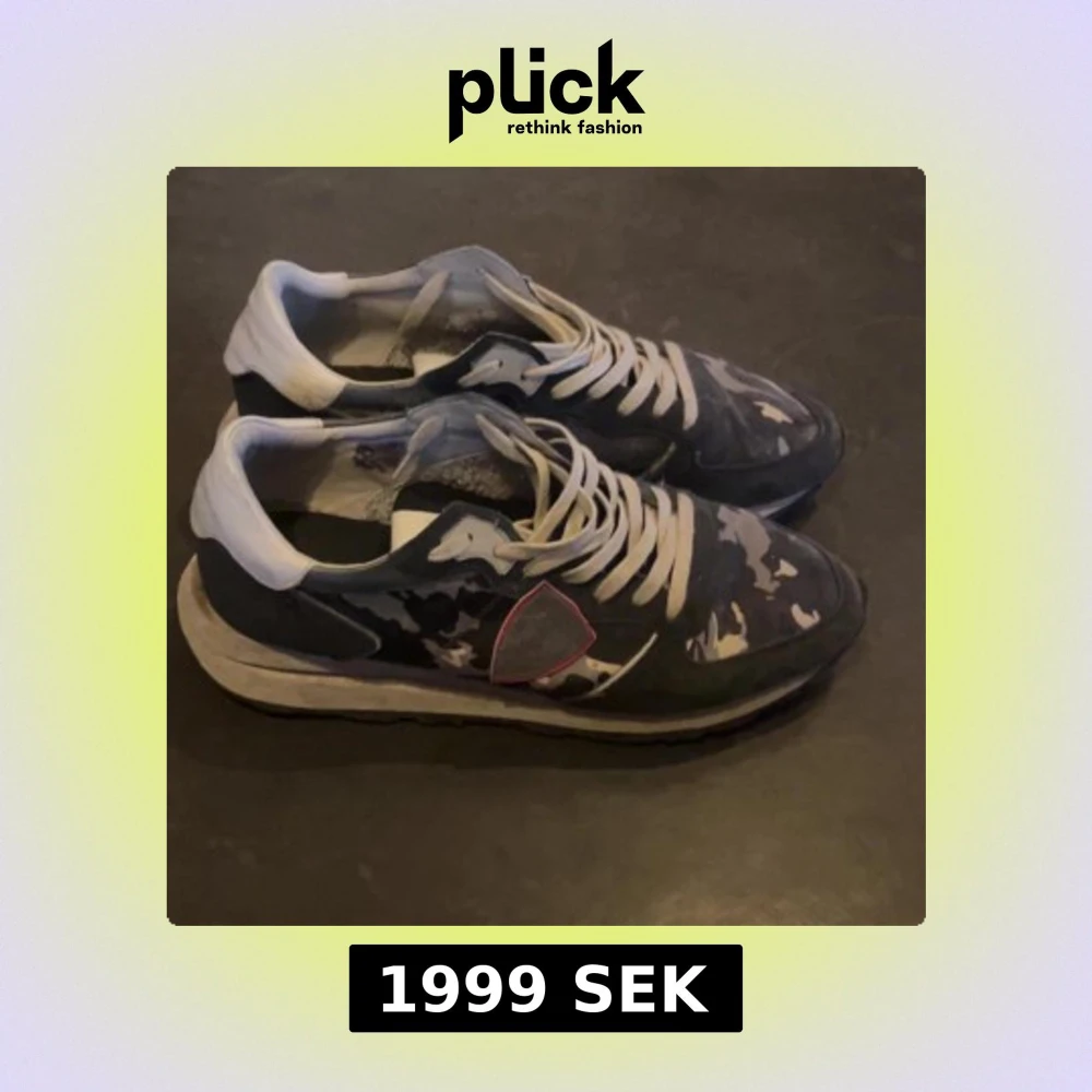 Säljer ett par Philippe Model sneakers i grått camouflagemönster med vita detaljer och snörning. Skorna har en platt sula och rund tå, samt en diskret logga på sidan. Perfekta för en avslappnad och trendig stil.