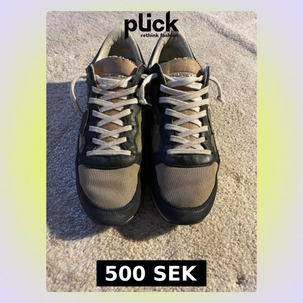 Snygga sneakers från Philippe Model med camouflagemönster i grönt och brunt, svarta skinnpaneler och beige mesh framtill. Perfekt för dig som gillar streetstyle. De är väldigt snygga och är i ganska bra skick. Det är bara sulan som är lite trasig som man ser på bilden. Hör av dig om du undrar något😁
