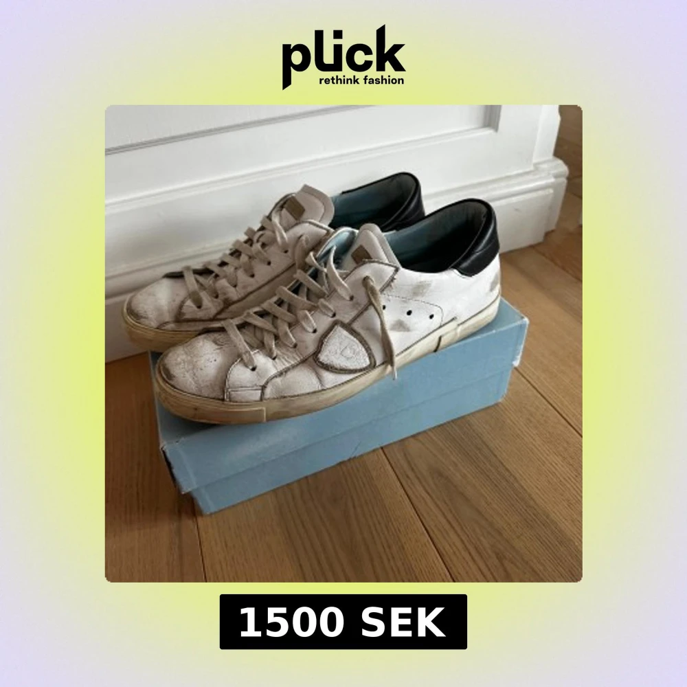 Säljer ett par vita Philippe Model sneakers i skinn med svarta detaljer vid hälen. Klassisk låg modell med snörning och rund tå. Snyggt märke på sidan och bekväm platt sula. Perfekta för dig som gillar stilrena och trendiga sneakers.