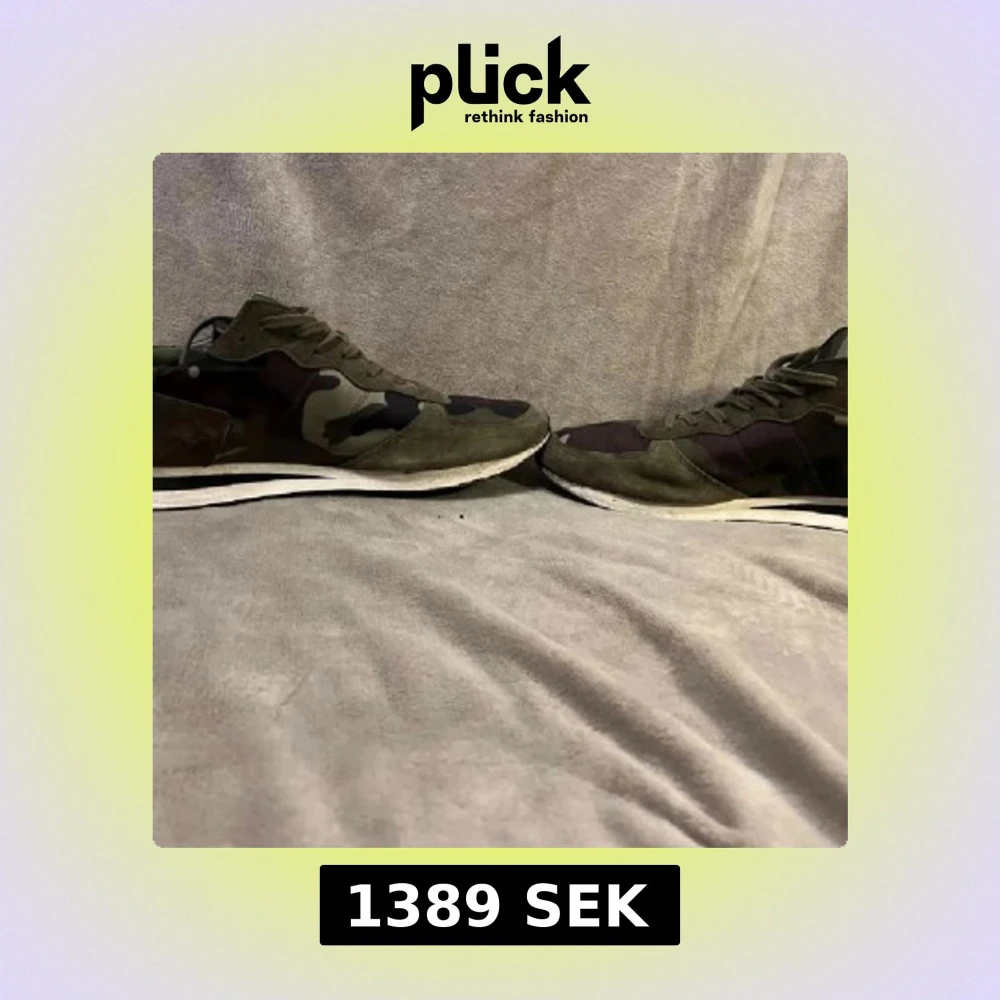 Säljer ett par snygga sneakers från Philippe Model i kamouflagefärgat mönster med gröna och bruna toner. Skorna har snörning, rund tå och detaljer i mocka. Perfekta för dig som vill sticka ut med en sportig och trendig look.46 9/10 skick två små defekter men syns inte
