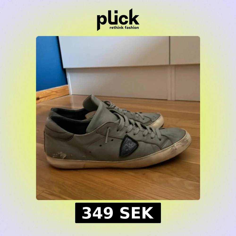 Ett par gråa/ljusblåa Philippe Model skor som har sätt bättre dagar. Storlek 44/45. Skriv vid frågor. Pris kan diskuteras.