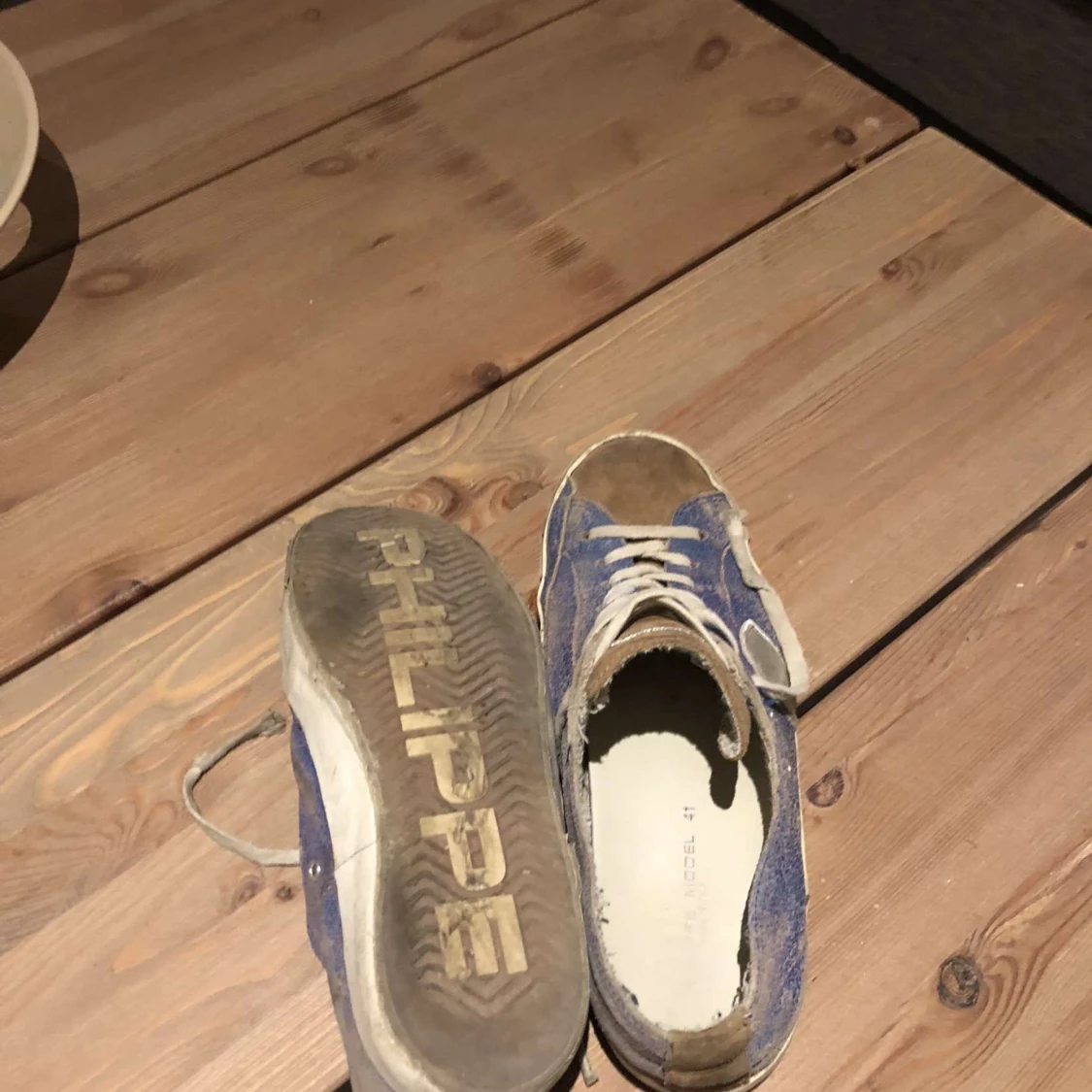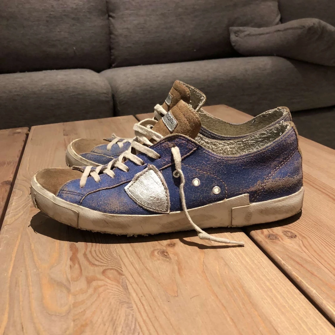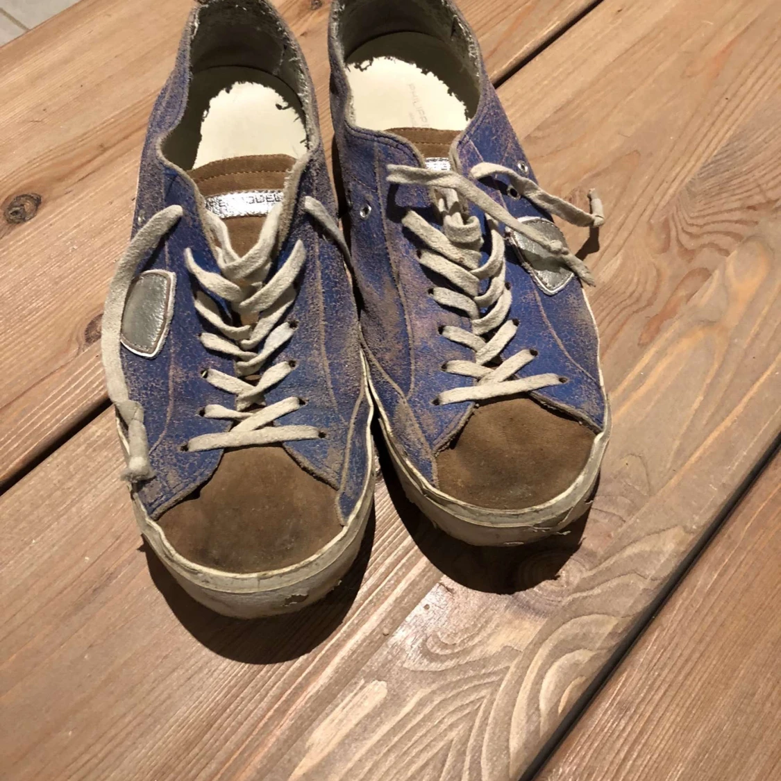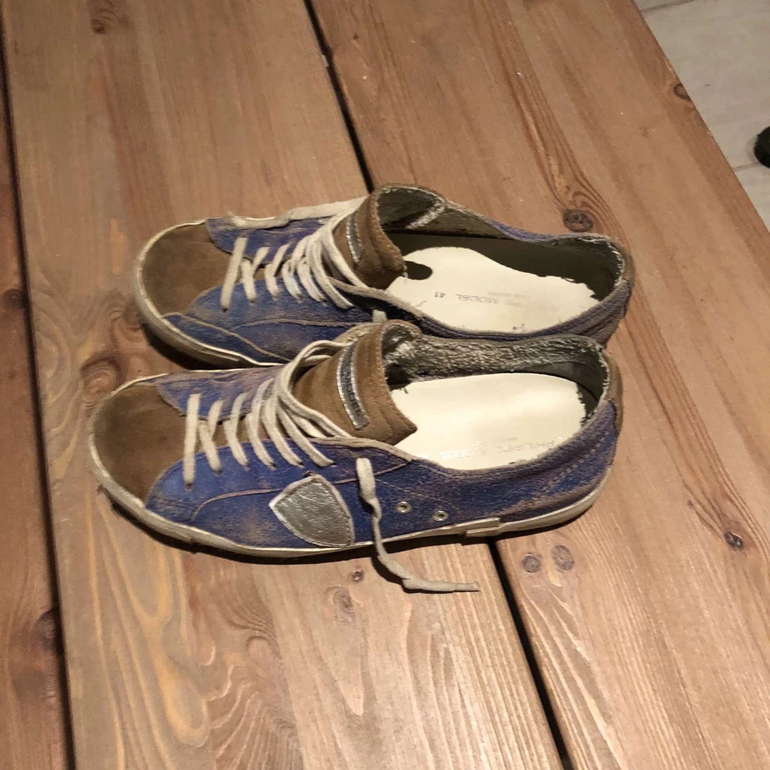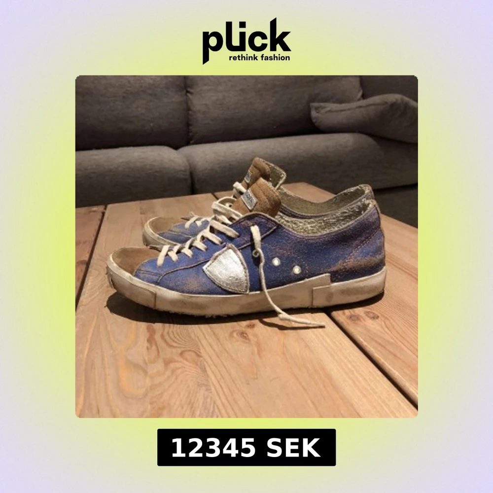 Skriv förslag på pris. Säljer ett par Philippe Model sneakers i blå med bruna detaljer och silverfärgade inslag. Skorna har vit sula, snörning och rund tå. Klassisk streetstil med coola kontraster och logga under sulan. Perfekta för dig som gillar unika sneakers.