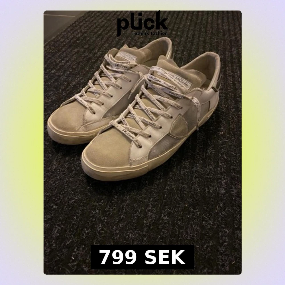 Ett par Philippe Models med storlek 43. Skorna har bra skick överlag men jag har lagat vissa delar med skolim (se bild 4,5 och 6).