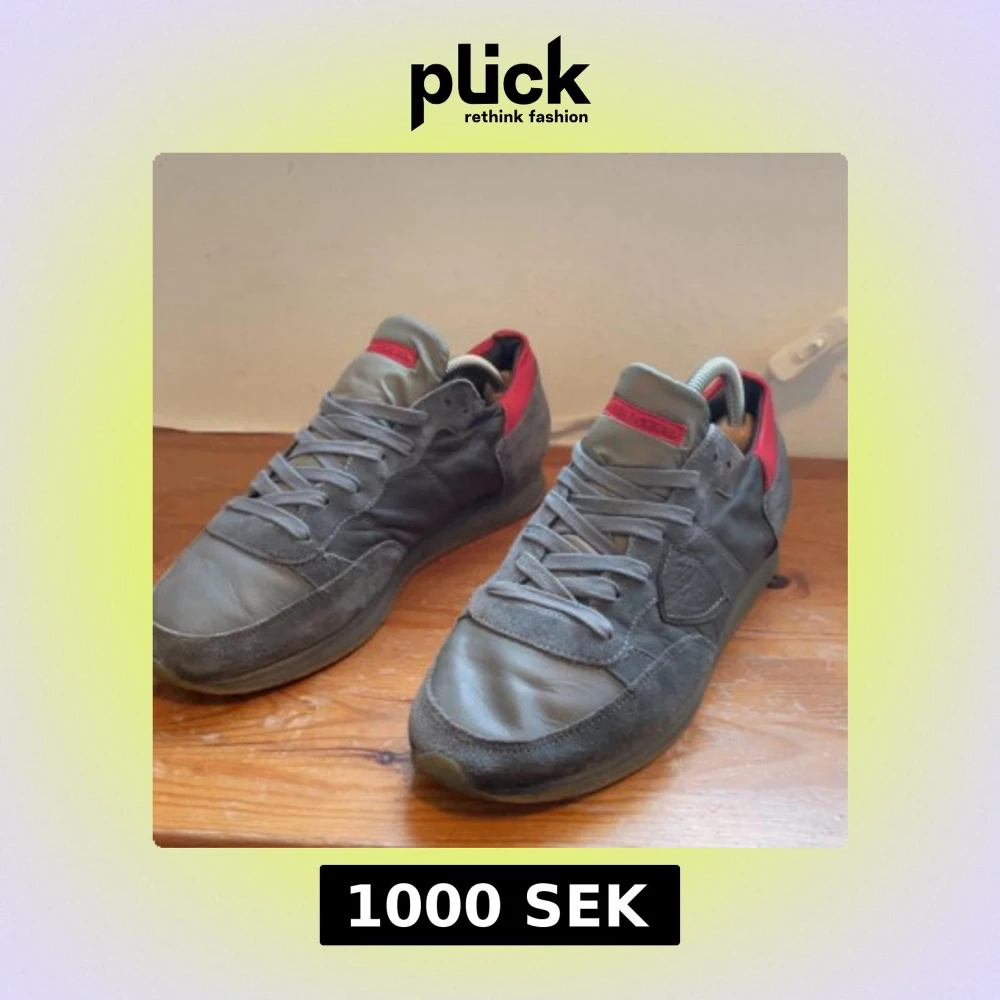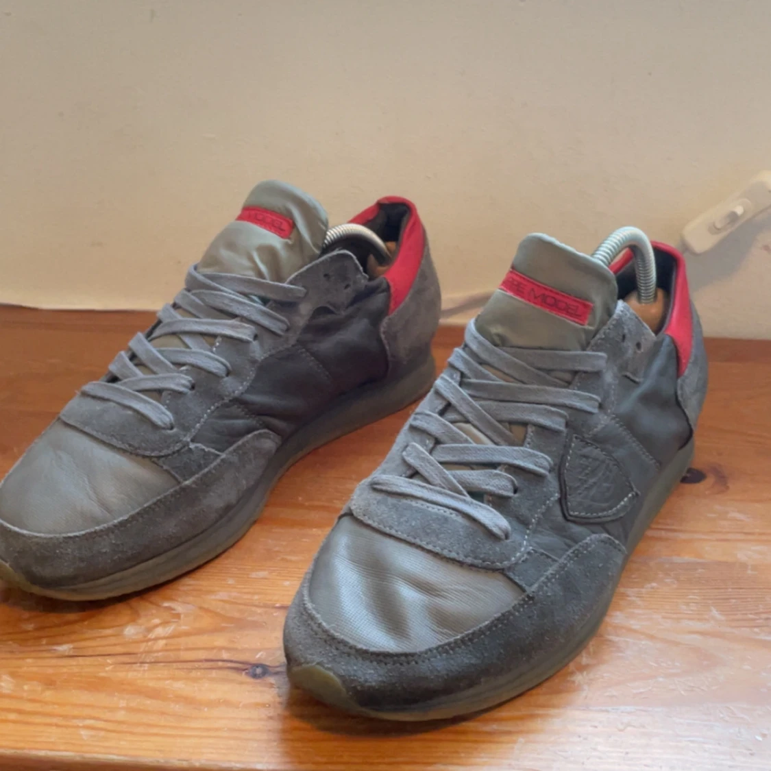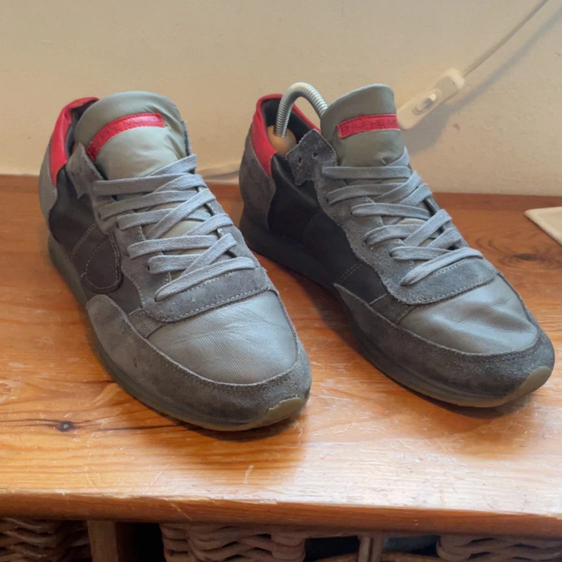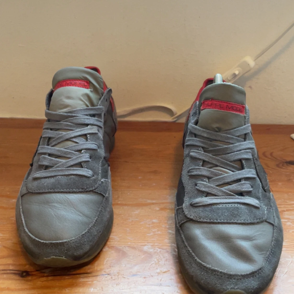 Snygga sneakers från Philippe Model i grått med coola röda detaljer på hälen. Skorna har snörning, rund tå och platt sula. Materialmix av mocka och skinn ger en schysst känsla och look. Perfekta för dig som gillar streetstyle och vill sticka ut lite extra. Strl 41