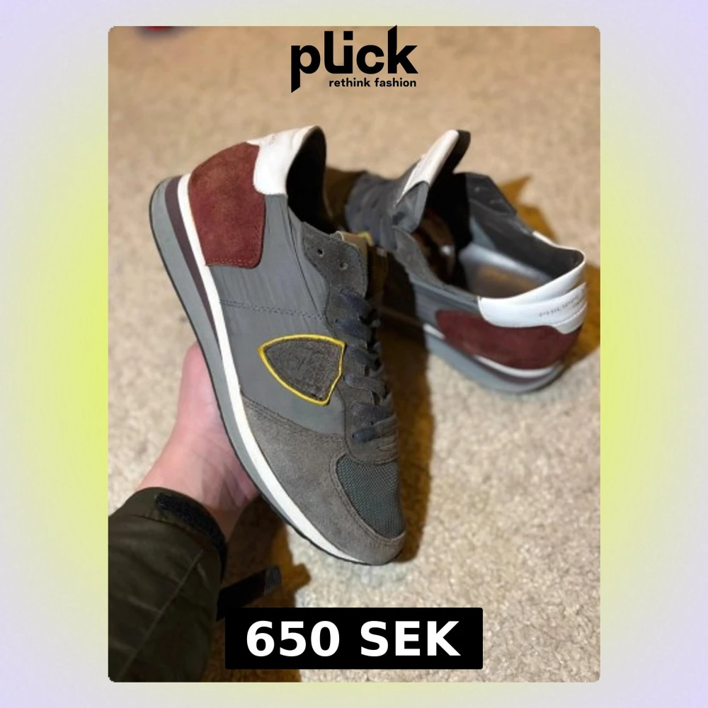 Snygga sneakers från Philippe Model i grått med mörkröda mockadetaljer och vit häl. Skorna har mesh på tån, snörning och en gul broderad sköld på sidan. Platt sula och rund tå ger en clean look. Perfekta för dig som gillar stilrena och exklusiva sneakers.