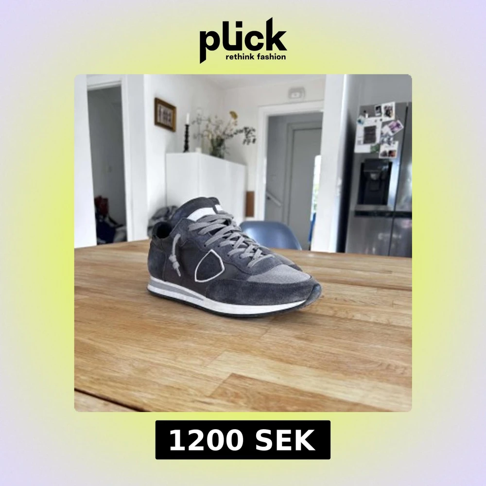 Säljer ett par grå Philippe Model sneakers med vita detaljer och snörning. Skorna har en rund tå, platt sula och är tillverkade i mocka och syntetmaterial. Perfekta för dig som gillar stilrena och sportiga skor.