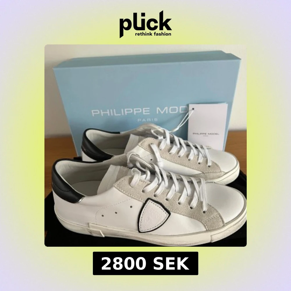 Snygga vita sneakers med svarta detaljer från Philippe Model. Skorna har en klassisk design med snörning och en stilren look. Perfekta för en trendig och avslappnad stil.