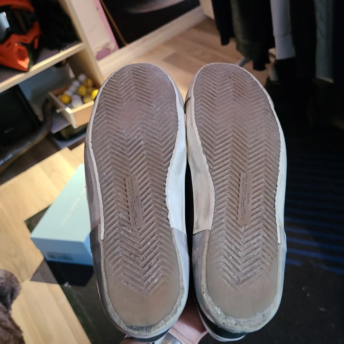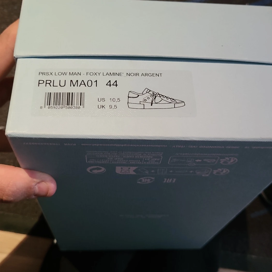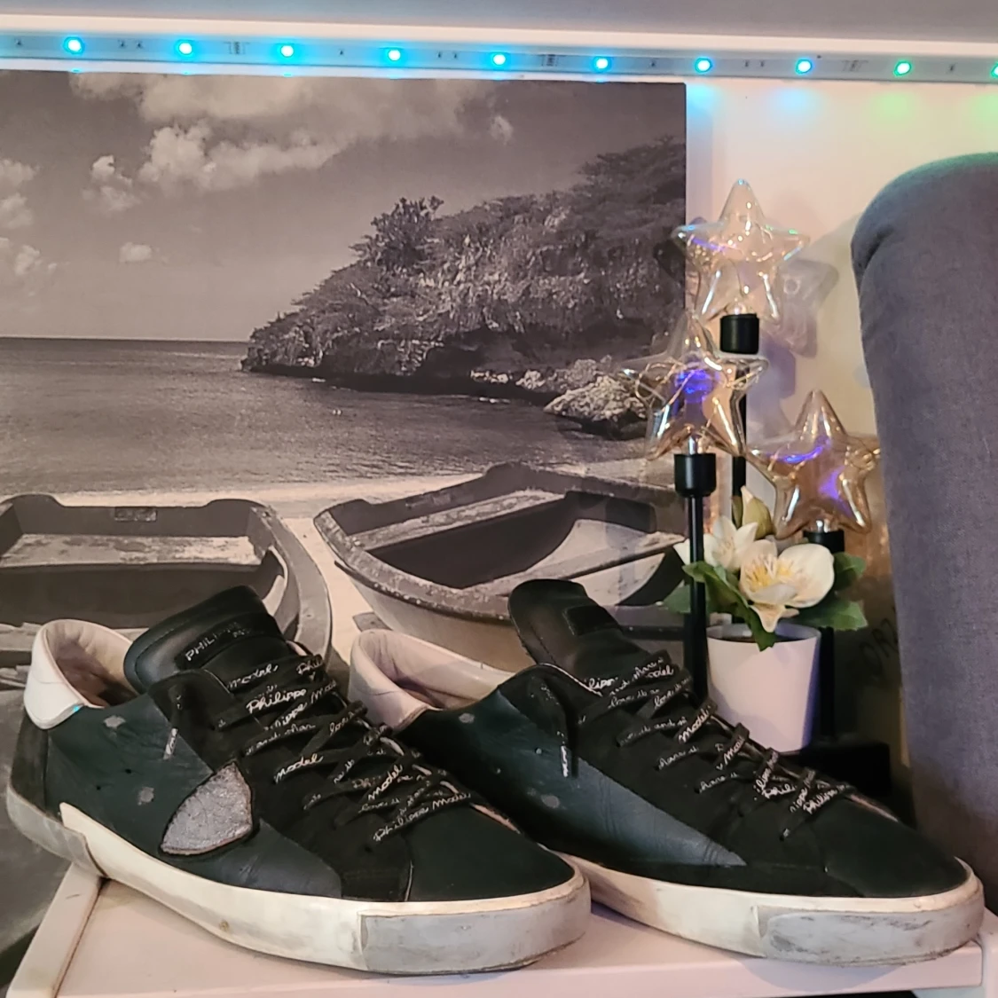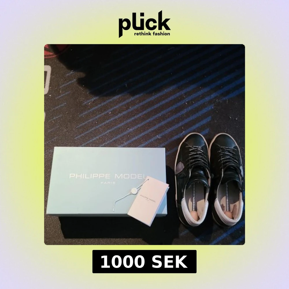 Säljer ett par svarta Philippe Model sneakers med vita och grå detaljer. Skorna har snörning, rund tå och platt sula. Märkeslogga syns på sidan och bak på hälen. Perfekta för dig som gillar stilrena och exklusiva sneakers. Dom är lite slitna i hälen under som man ser kan skicka bättre bild men man känner inte det alls det läcker ej in nå vatten osv... riktigt fina skor enligt mig fortfarande bra skick. Har lagat skadorna själv med gorilla glue och sånt, har fungerat utmärkt.