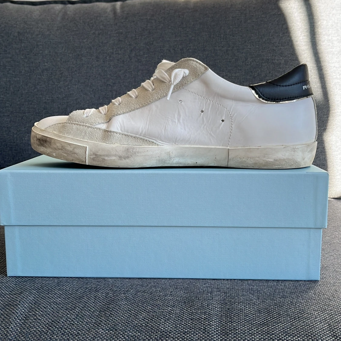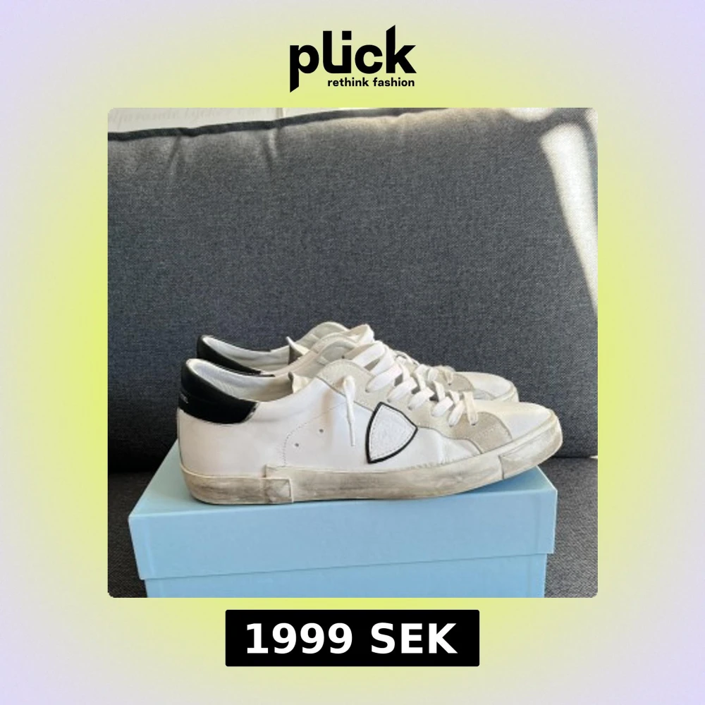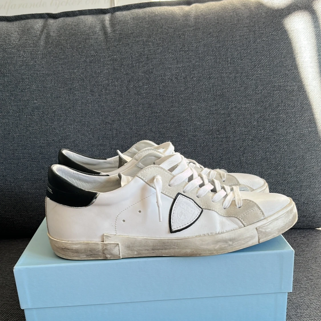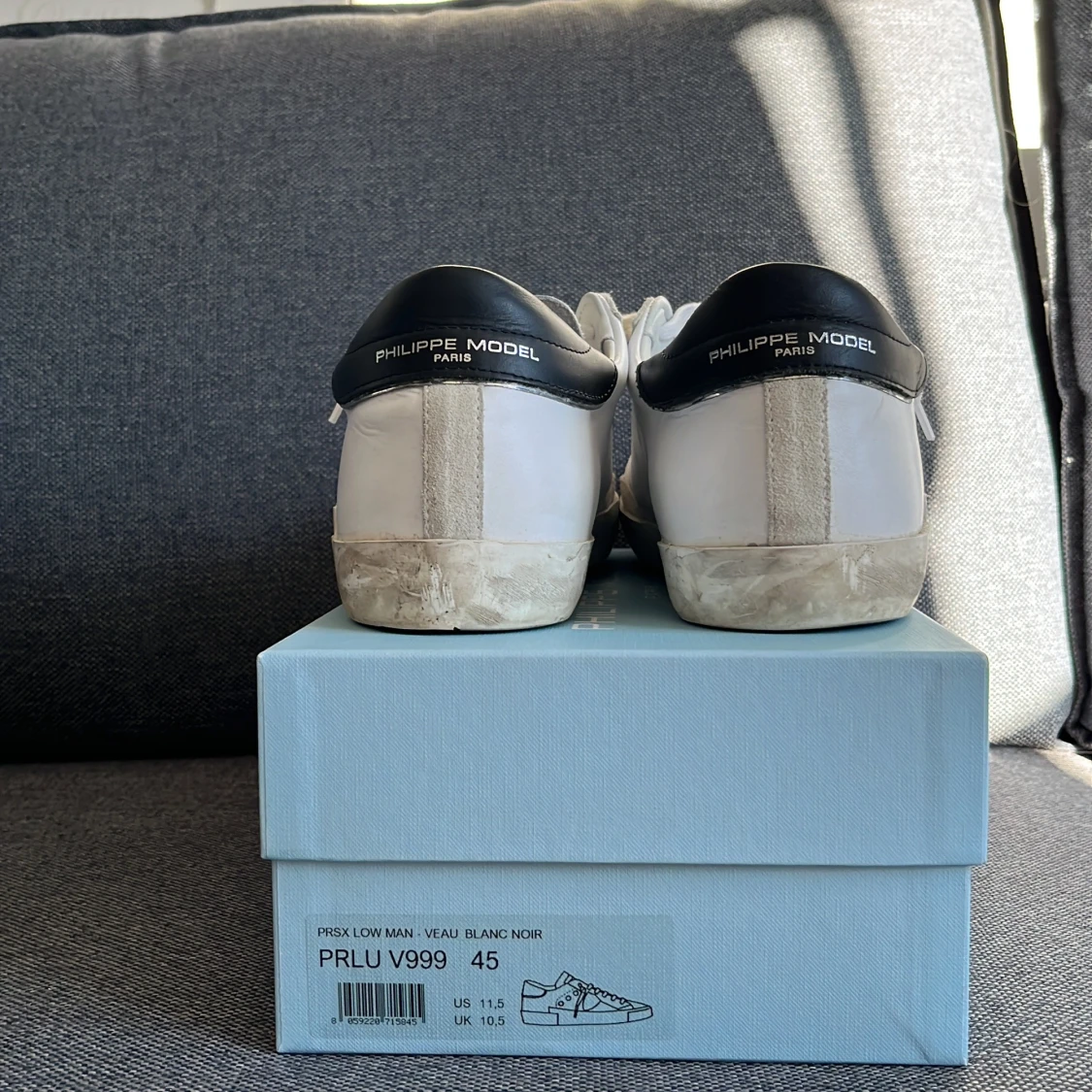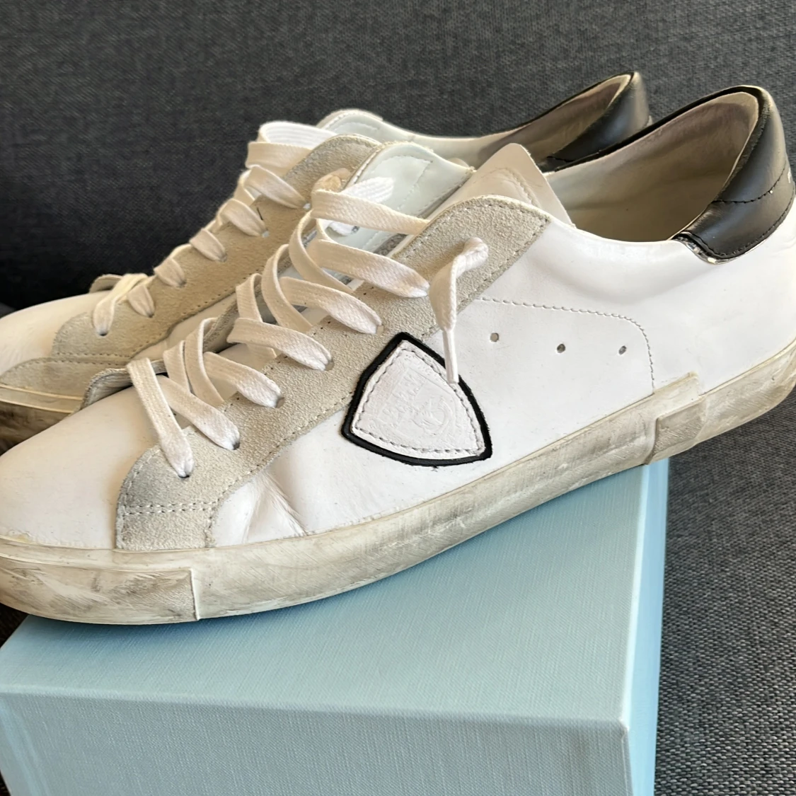 Snygga vita sneakers från Philippe Model med svarta detaljer och snörning. Skorna har en rund tå och är tillverkade i skinn med en stilren design perfekt till sommaren. Små tecken på användning men använd väldigt sparsamt. Box och dustbag följer såklart med. Tveka inte vid funderingar!😁Trades funkar också.