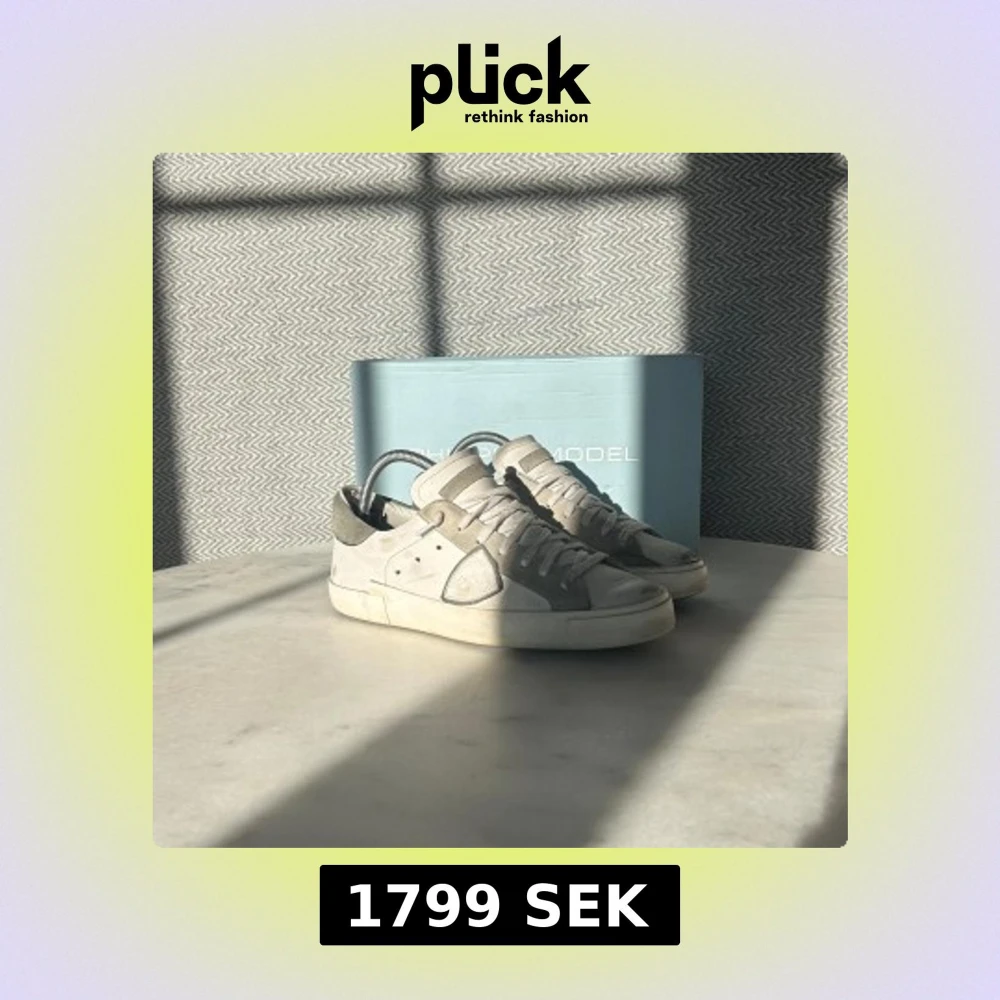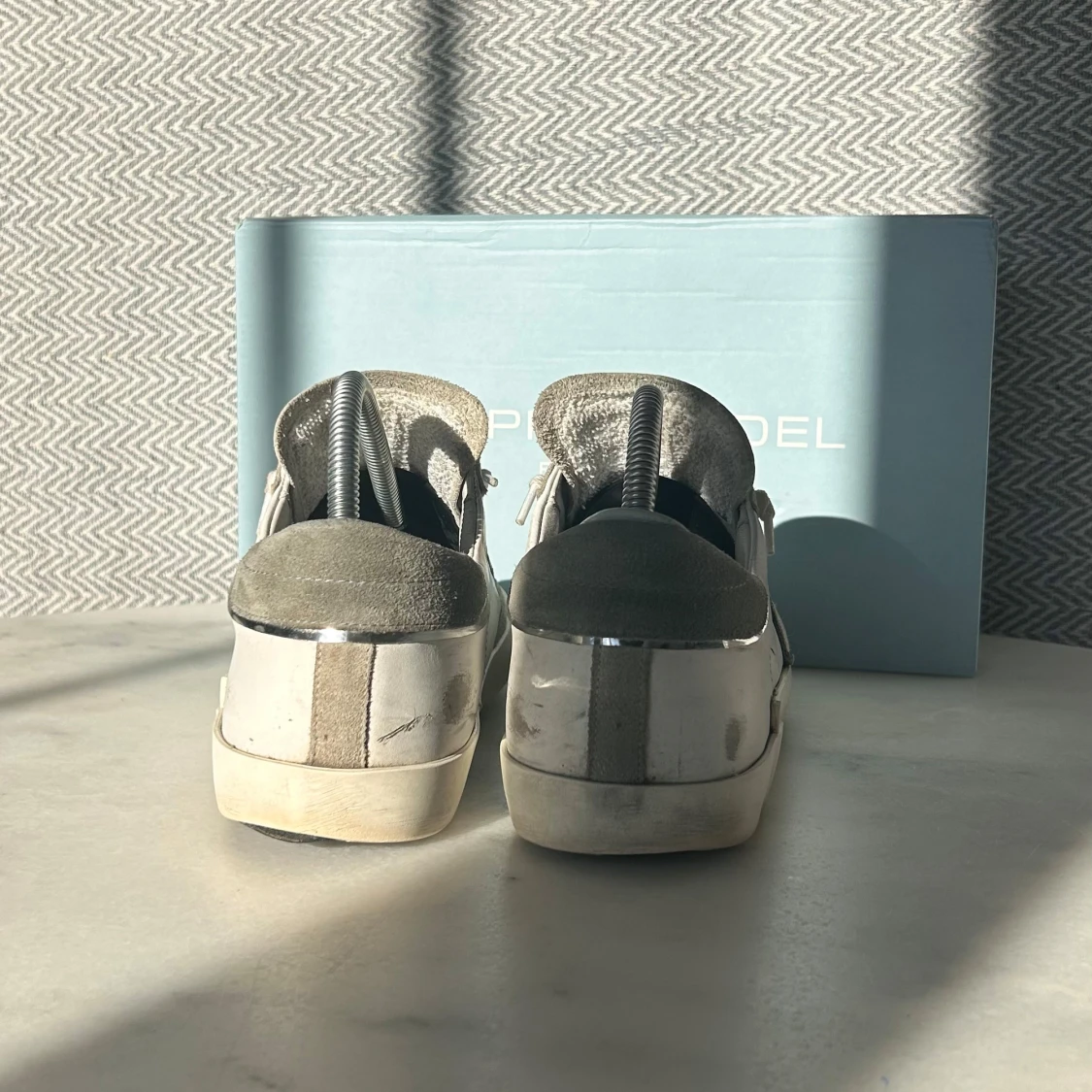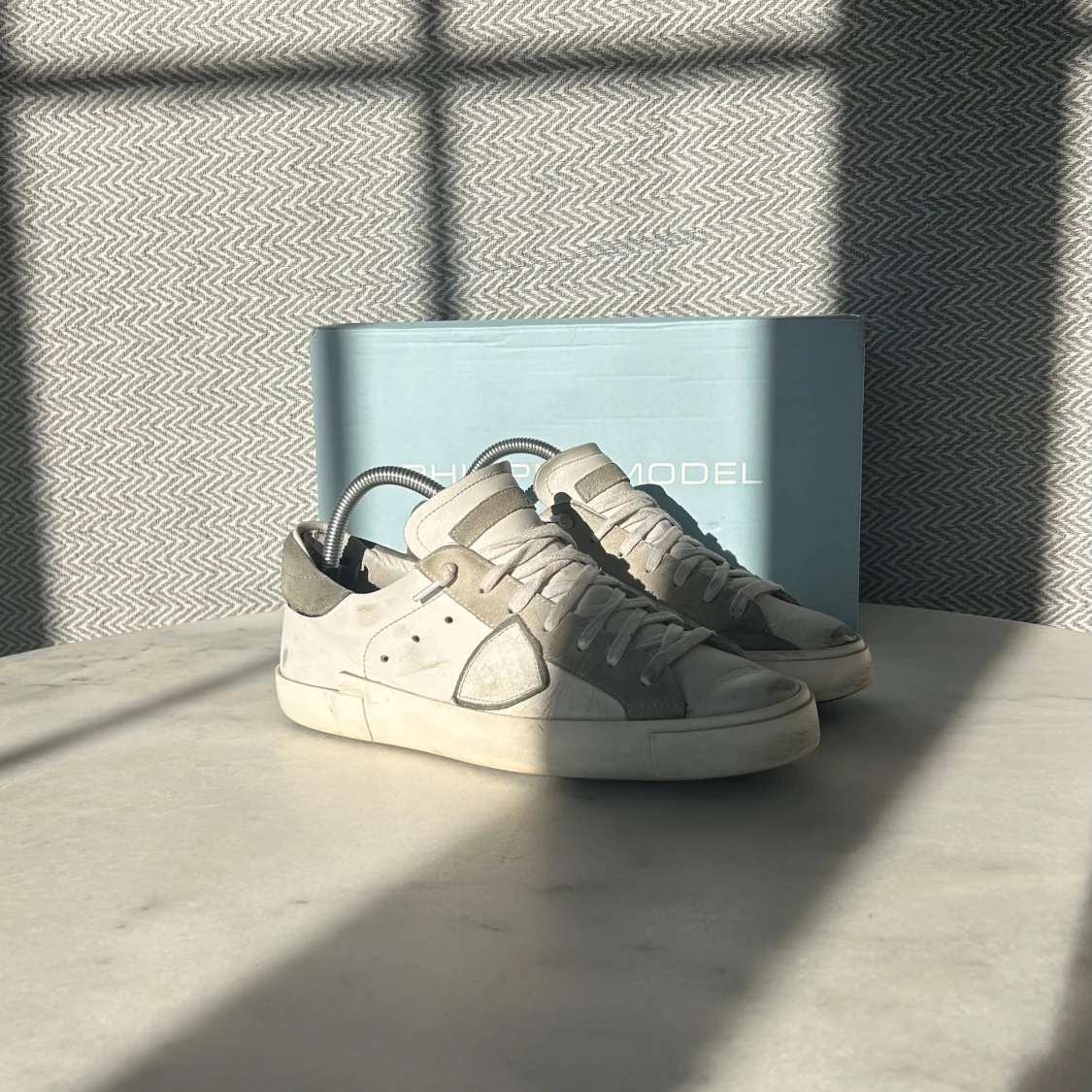 Snygga sneakers från Philippe Model i en stilren kombination av grått och vitt samt ljusblått. Skorna har en klassisk design med snörning och en diskret logga på sidan. Stolek: 40 men passar även 41. Skick: (7/10) Enda defekten är att hälen på insidan är lite sliten.