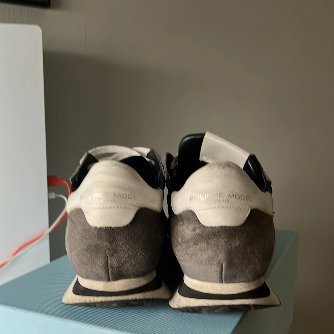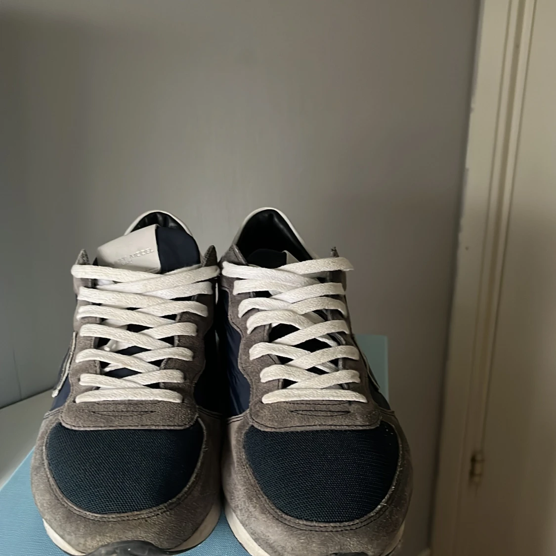 Snygga sneakers i grått och blått med vita snören och detaljer i mocka. Skorna har en stilren design med en vit sula och är perfekta för en avslappnad stil. Nypris: 3000kr Blåa snöre, skopåse och box ingår. Pris kan diskuteras