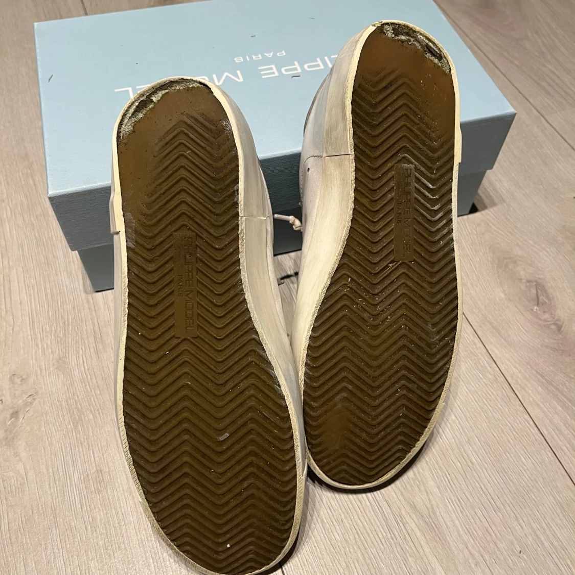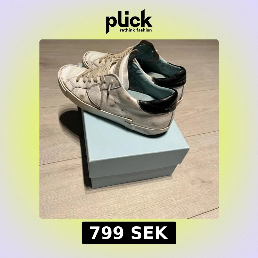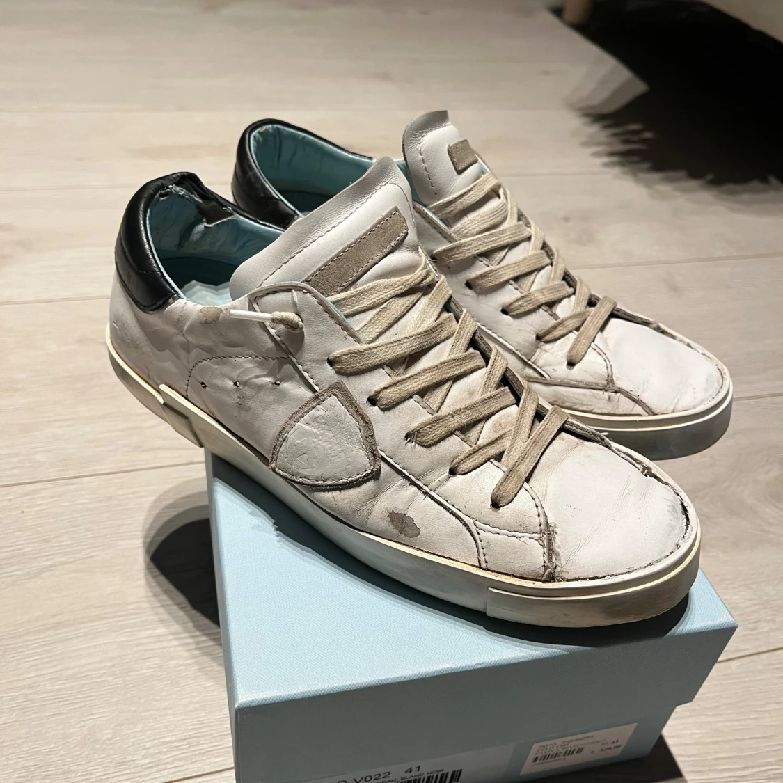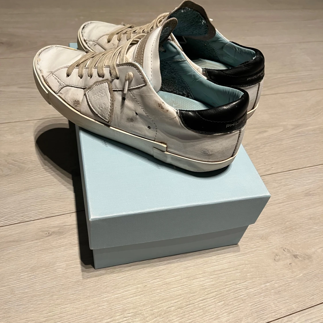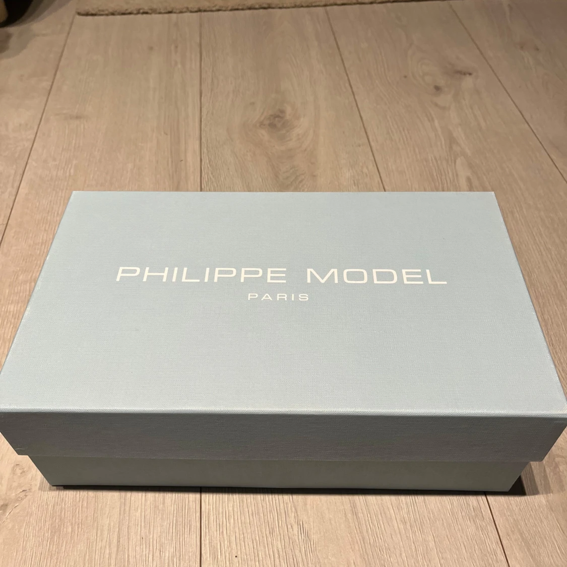 Snygga vita sneakers från Philippe Model med svarta detaljer på hälen och klassisk snörning. Skorna är tillverkade i skinn och har en platt sula. Perfekta för dig som gillar en stilren och avslappnad look. Storlek 41, jag har kvitto och lådan medföljer även.