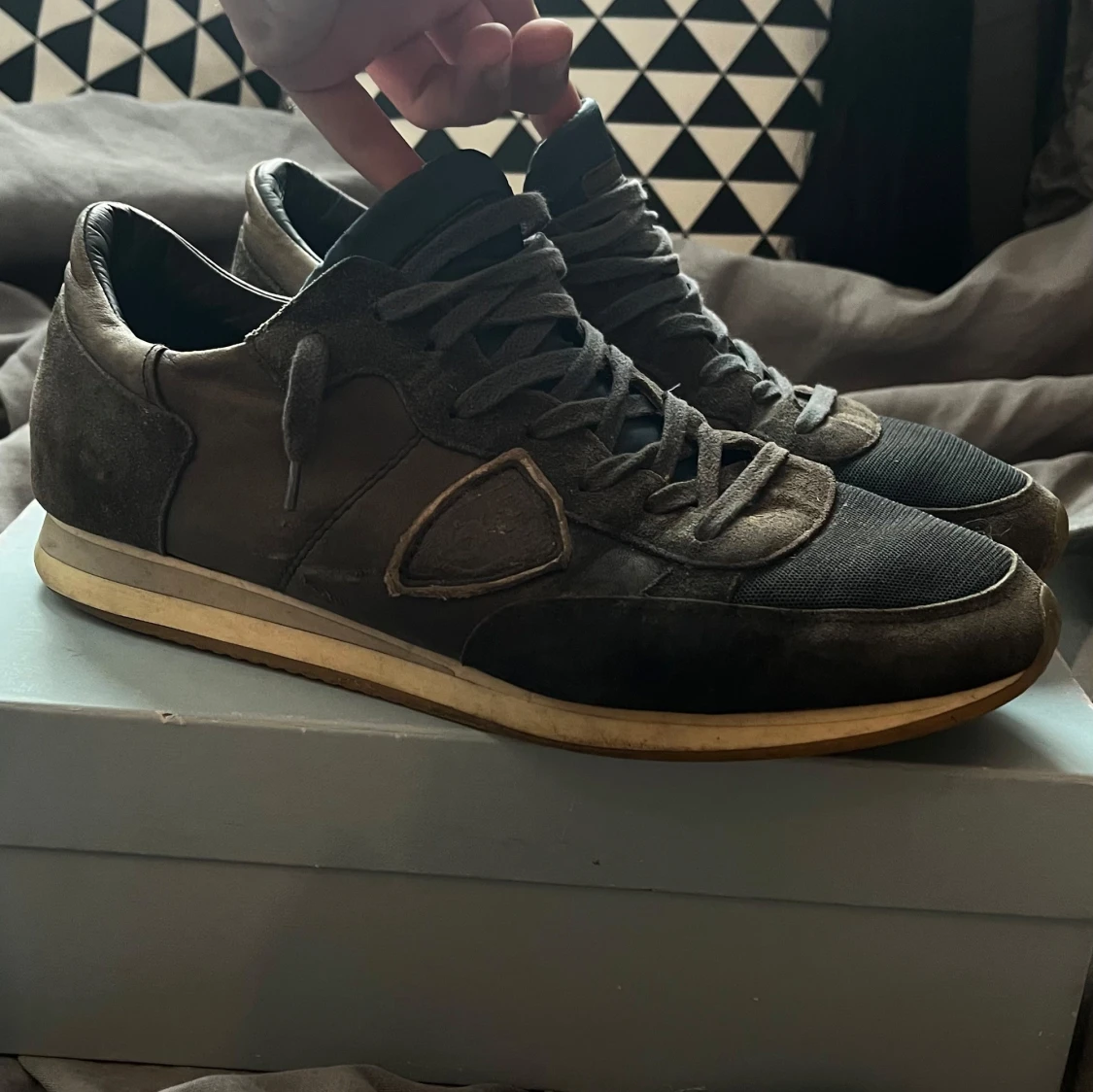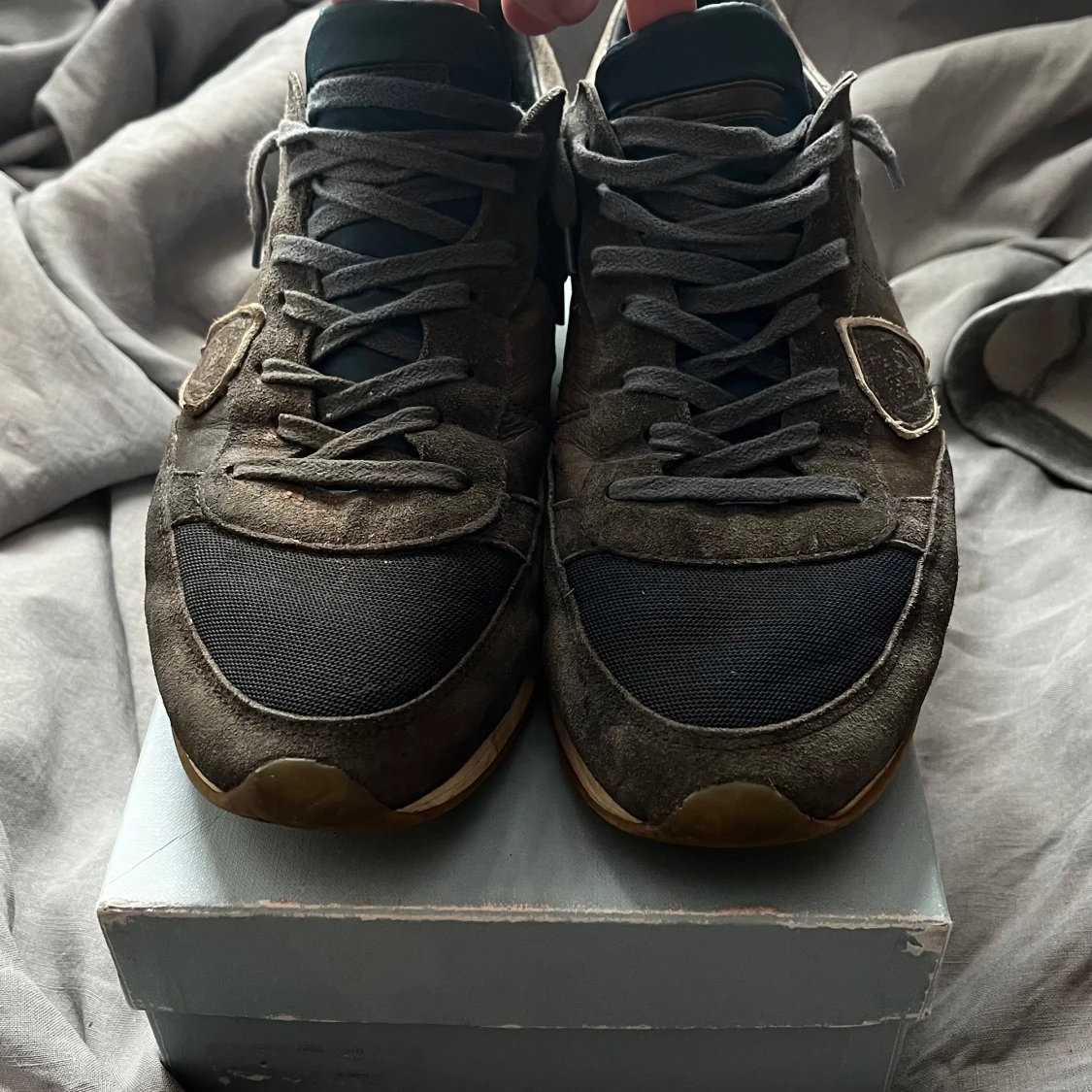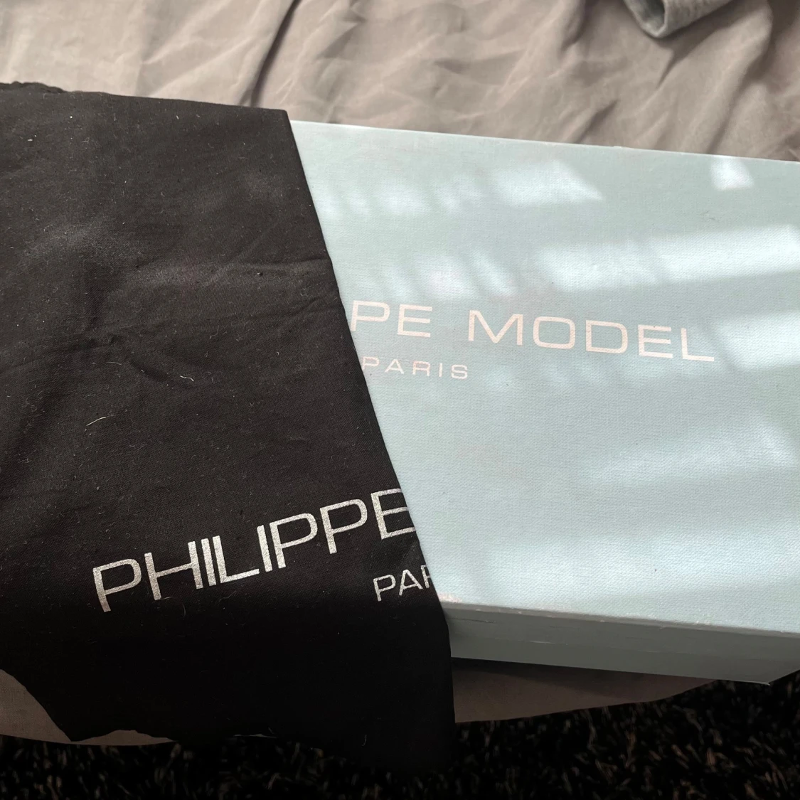 Snygga mörkblåa sneakers från Philippe Model med detaljer i mocka och textil. Skorna har rund tå, snörning och en beige sula. Klassisk logotyp på sidan och stilren design som passar till det mesta. Perfekta för dig som gillar en clean och bekväm sko. Storlek 43, skick: mycket bra bara sulan som är lite sliten men så är de på alla skor annars är mockan i väldigt bra skick, går såklart fräscha upp skorna då dem är lite smutsiga nu.🙌