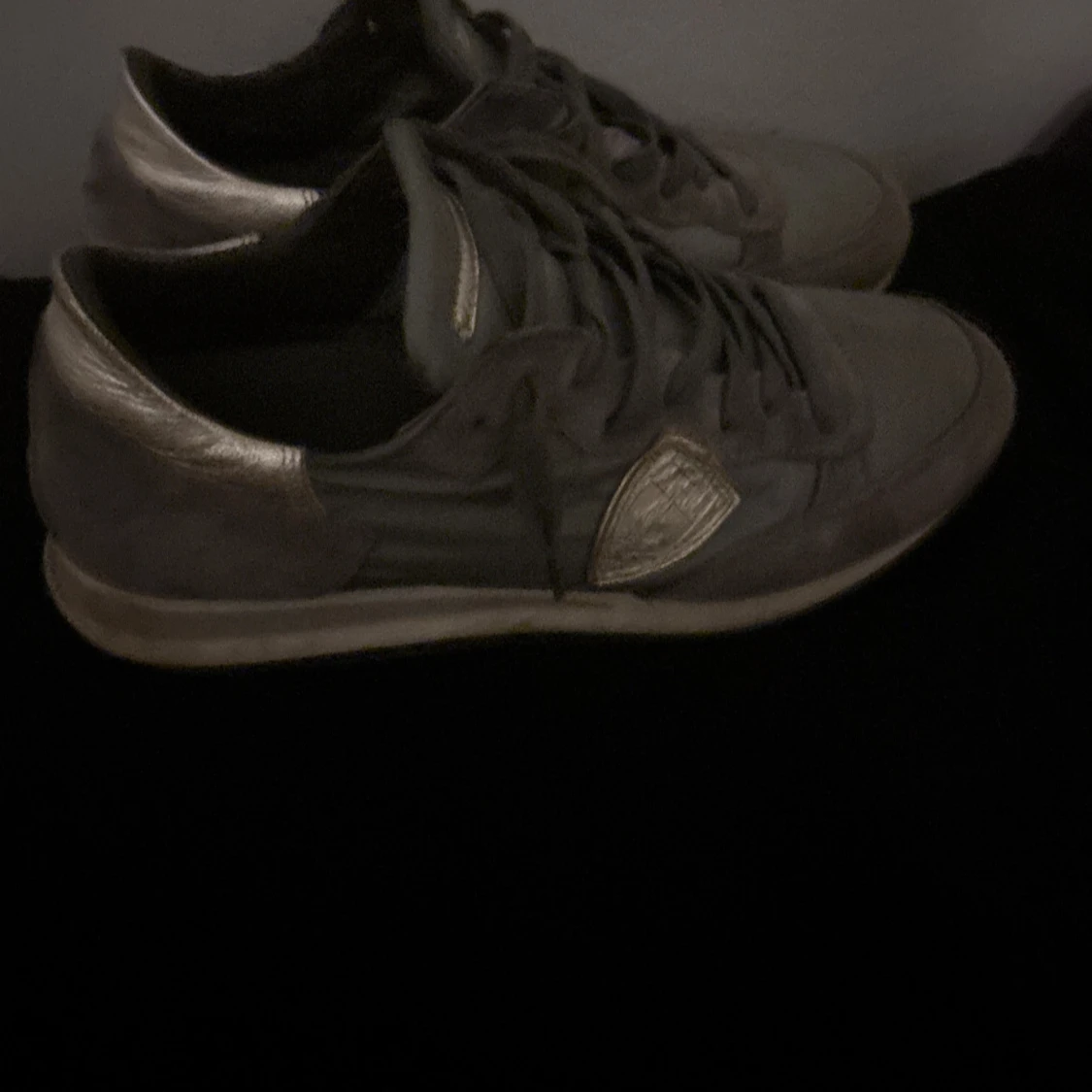 Snygga grå sneakers från Philippe Model med metallic-silver detaljer på häl och plös. Skorna har snörning och en rund tå, samt en platt sula. Materialet är en mix av skinn och mocka, vilket ger en lyxig känsla och cool look. ✔️ Äkta Philippe Model ✔️ Storlek: 40 ✔️ Bekväma och lätta ✔️ Passar både till vardags och till en mer uppklädd stil