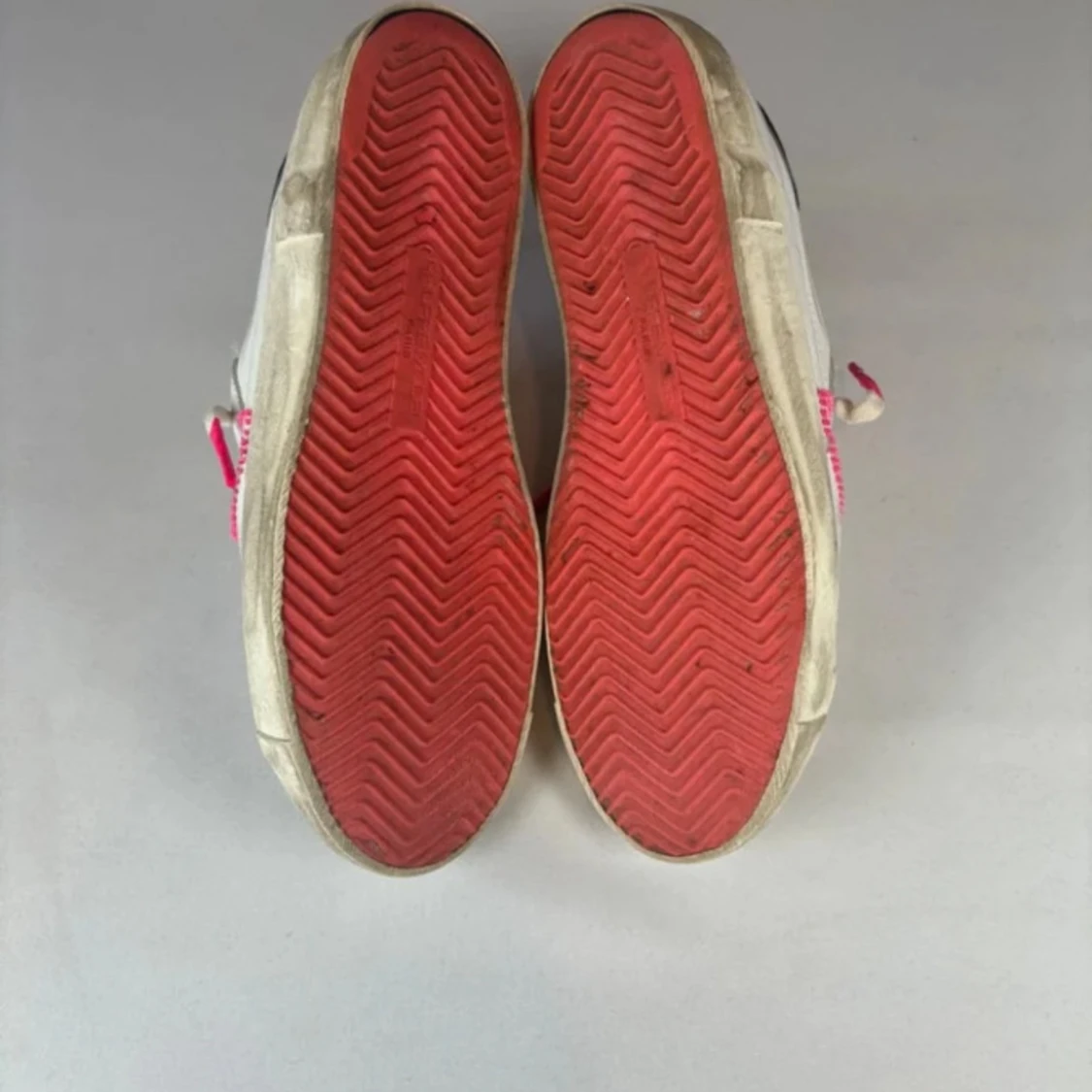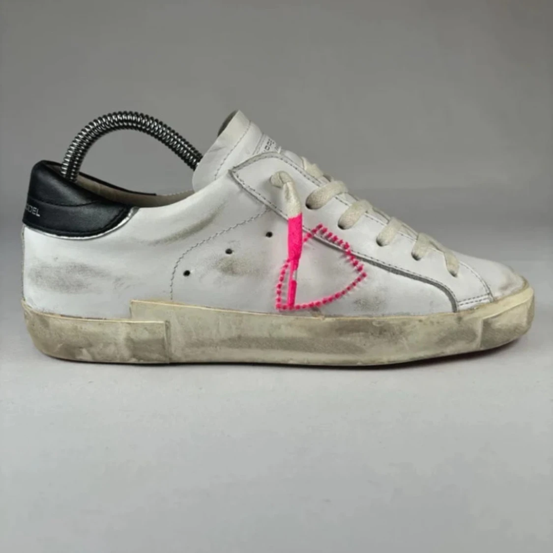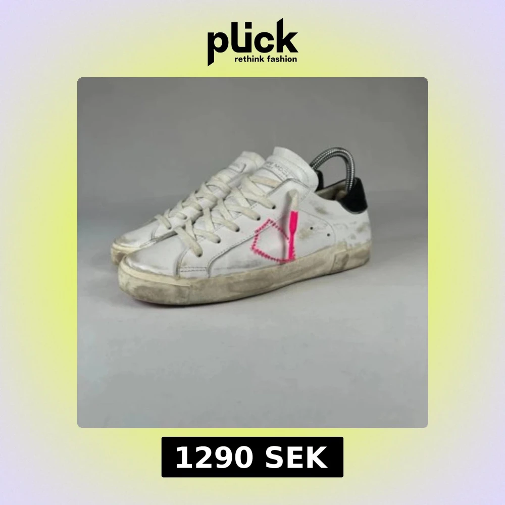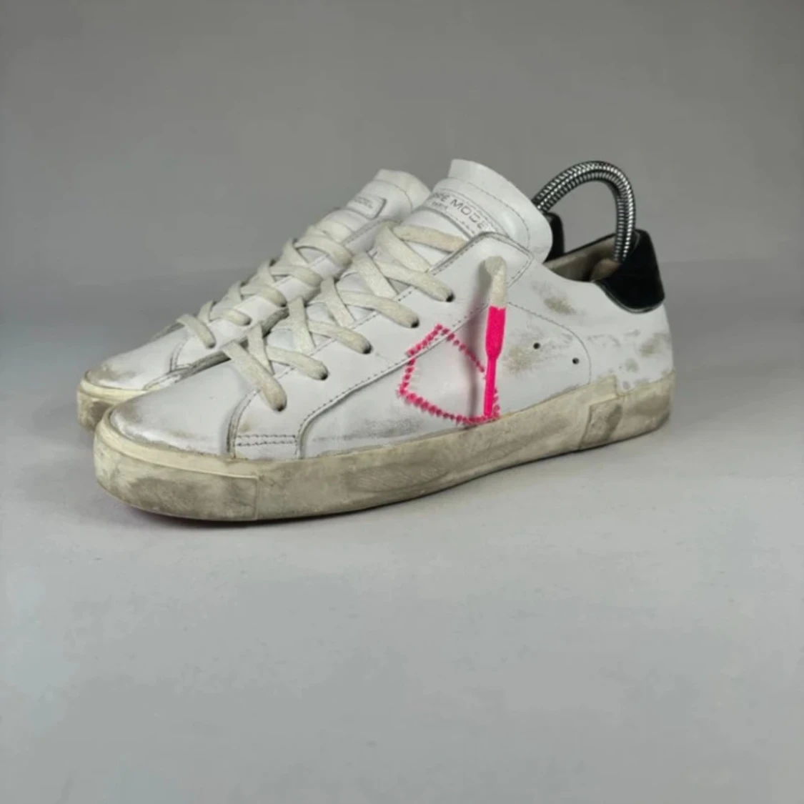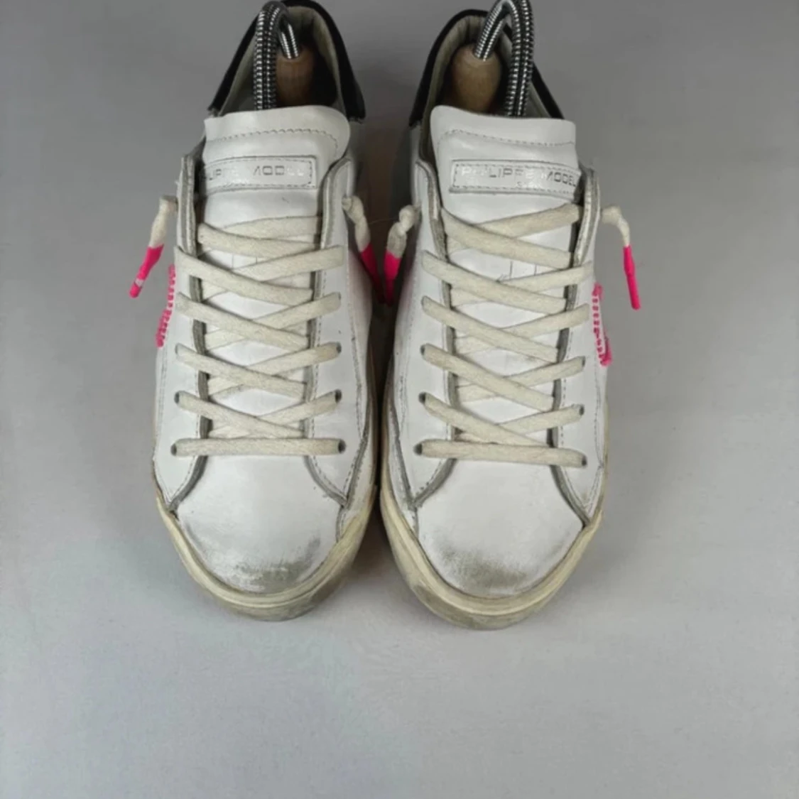Snygga vita sneakers från Philippe Model med svart häl och en unik rosa broderad detalj på sidan. Skorna har snörning och röd sula, tillverkade i skinn. Perfekta för dig som vill sticka ut med en cool detalj. Skick 9/10