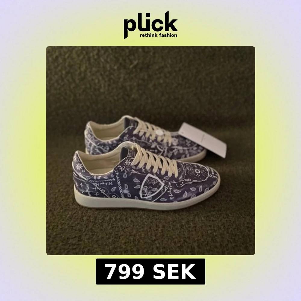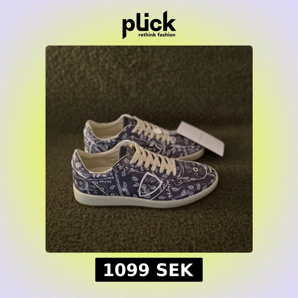 Snygga sneakers från Philippe Model med marinblå bas och vitt bandanamönster över hela skon. Skorna har vita snören, rund tå och platt sula. Perfekta för dig som vill sticka ut med en cool och unik design. Materialet är skinn och textil.