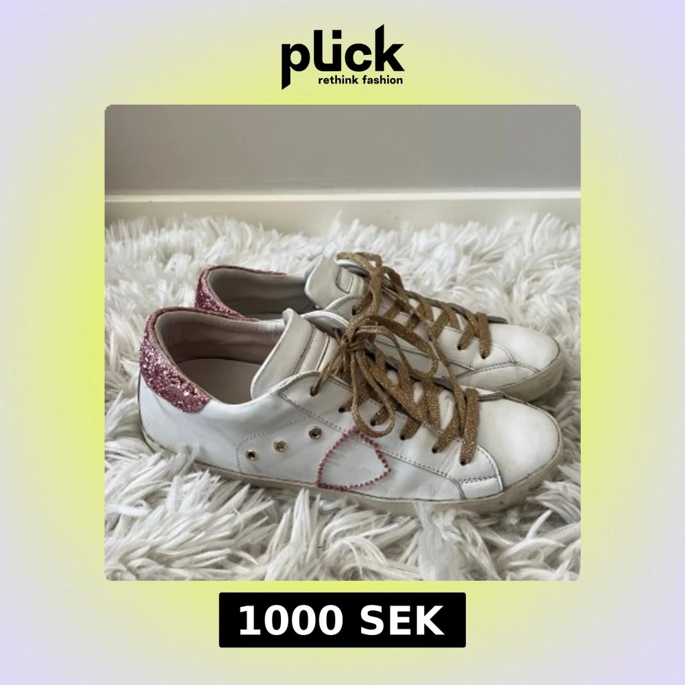 Snygga vita Philippe Model sneakers i skinn med guldiga snören, rosa glitter på hälen och ett broderat hjärta på sidan. Perfekta för dig som vill sticka ut med lite extra bling. Köpta på sellpy.